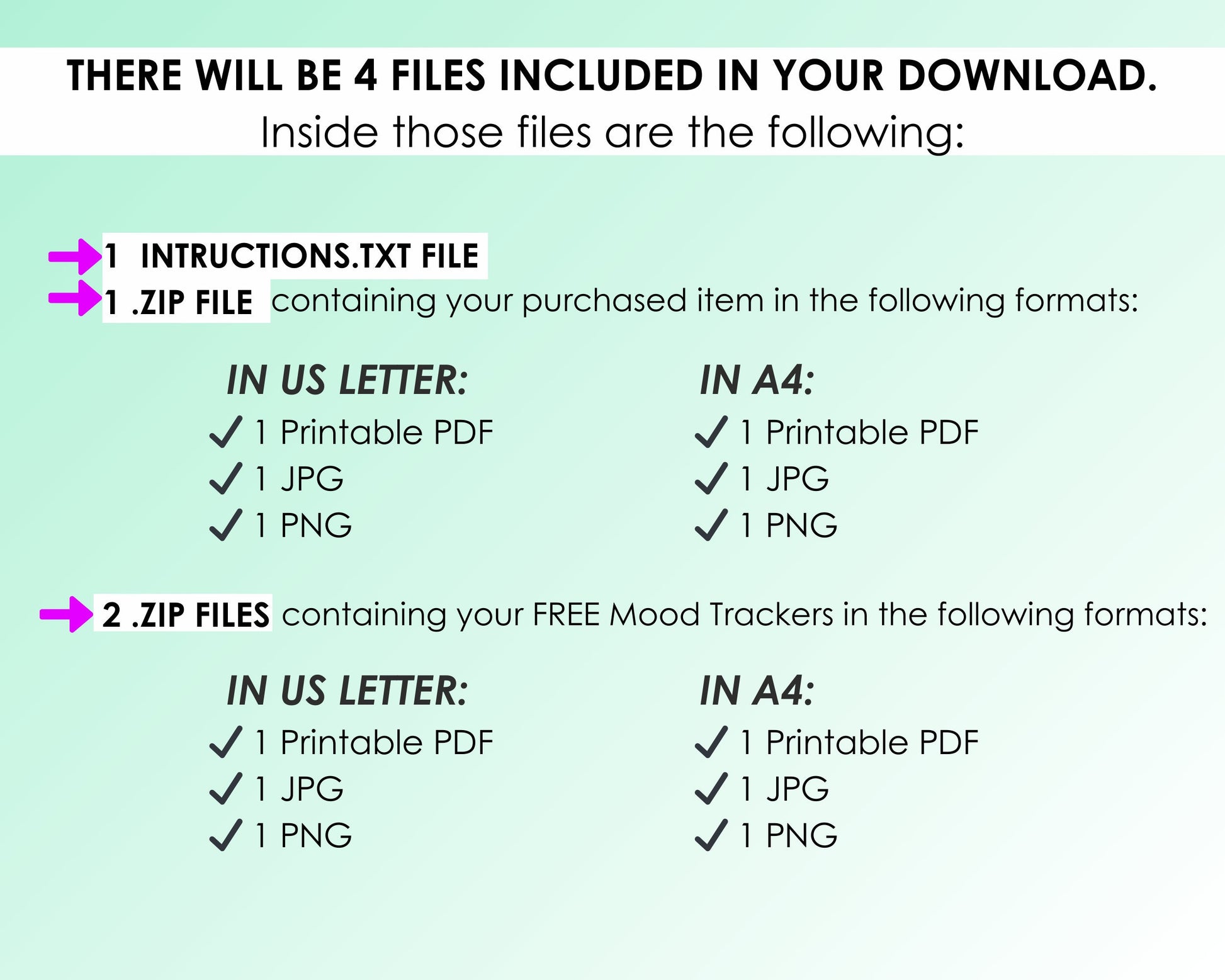There will be 4 files included in your download from Etsy. Inside those files are the following: