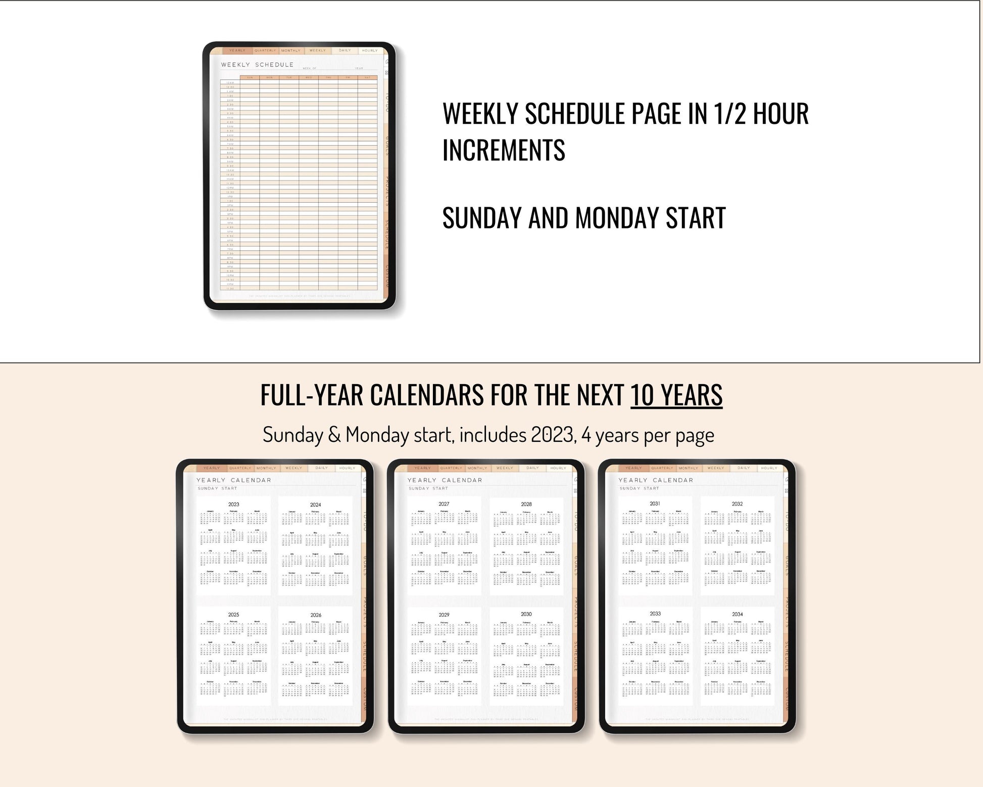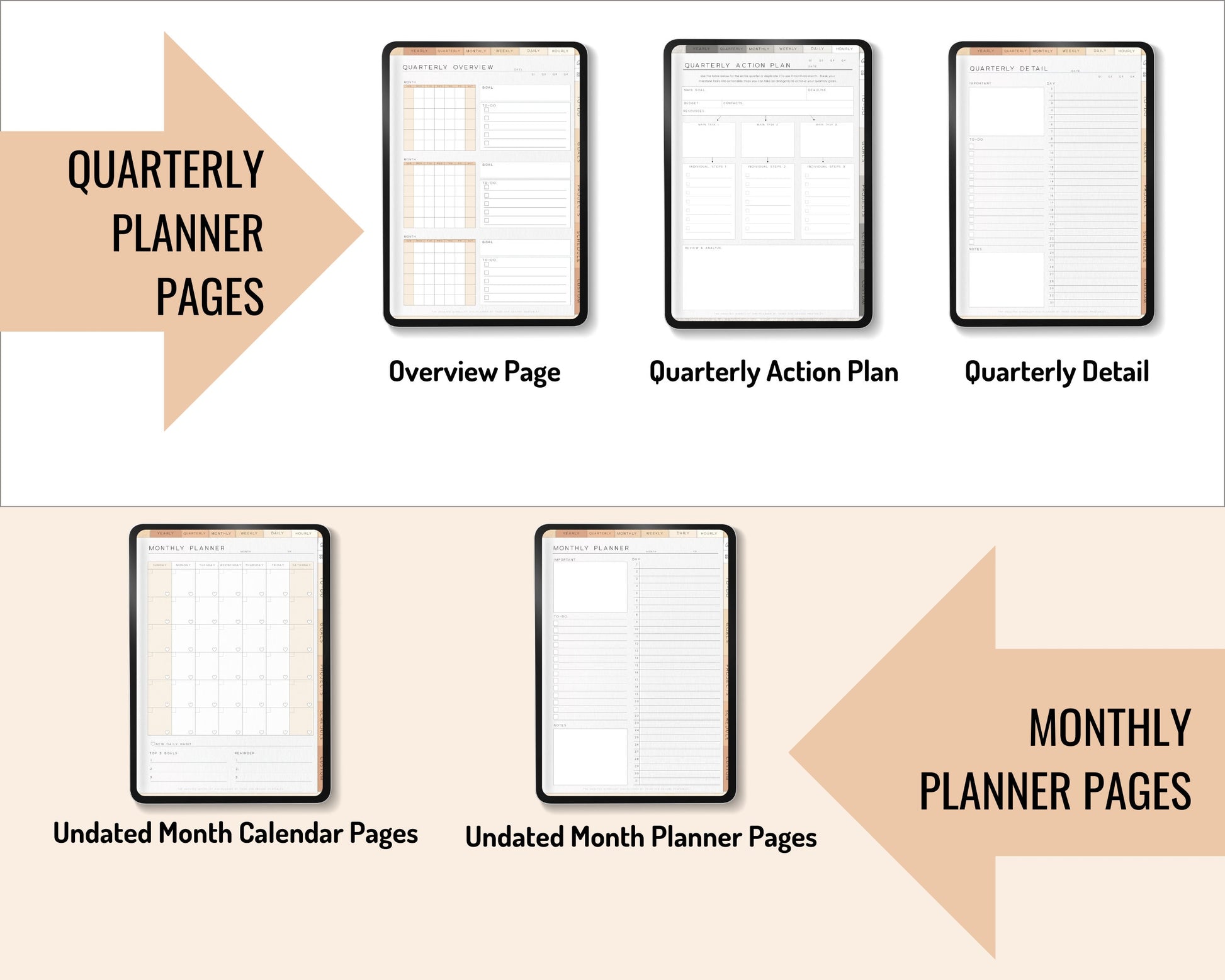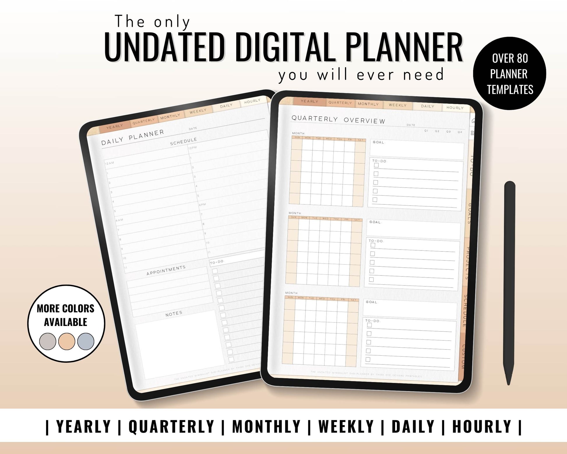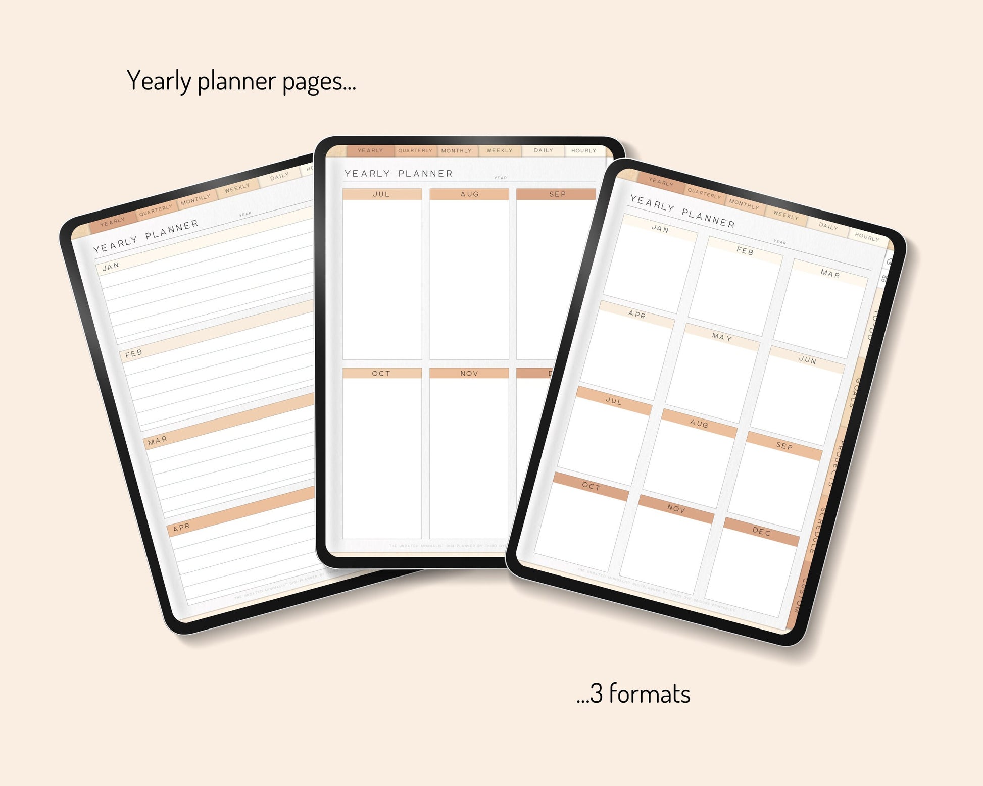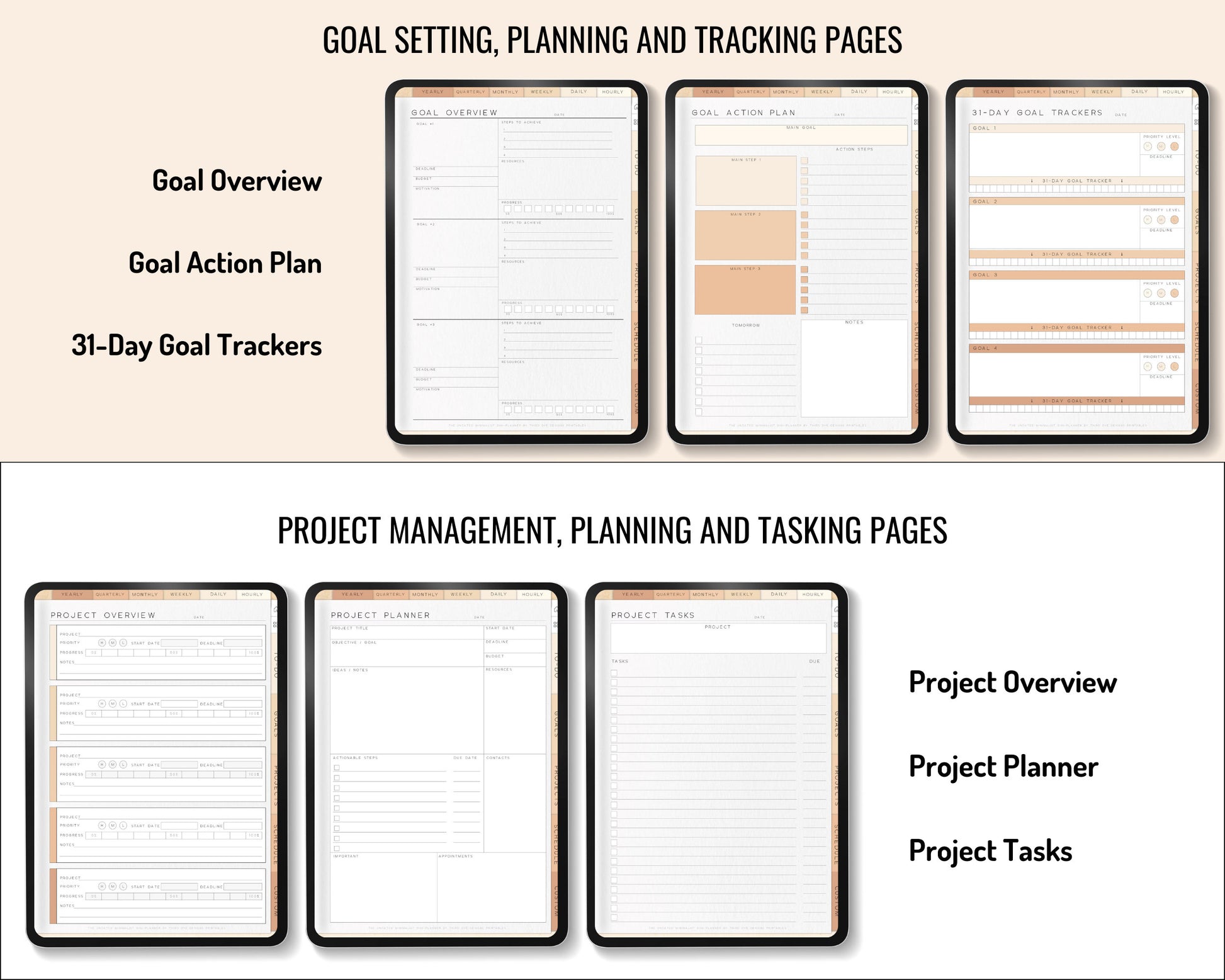 Sustainable digital planner featuring undated half-hourly hourly, daily, weekly, monthly, quarterly and yearly templates, as well as goal-setting, project and time management templates.