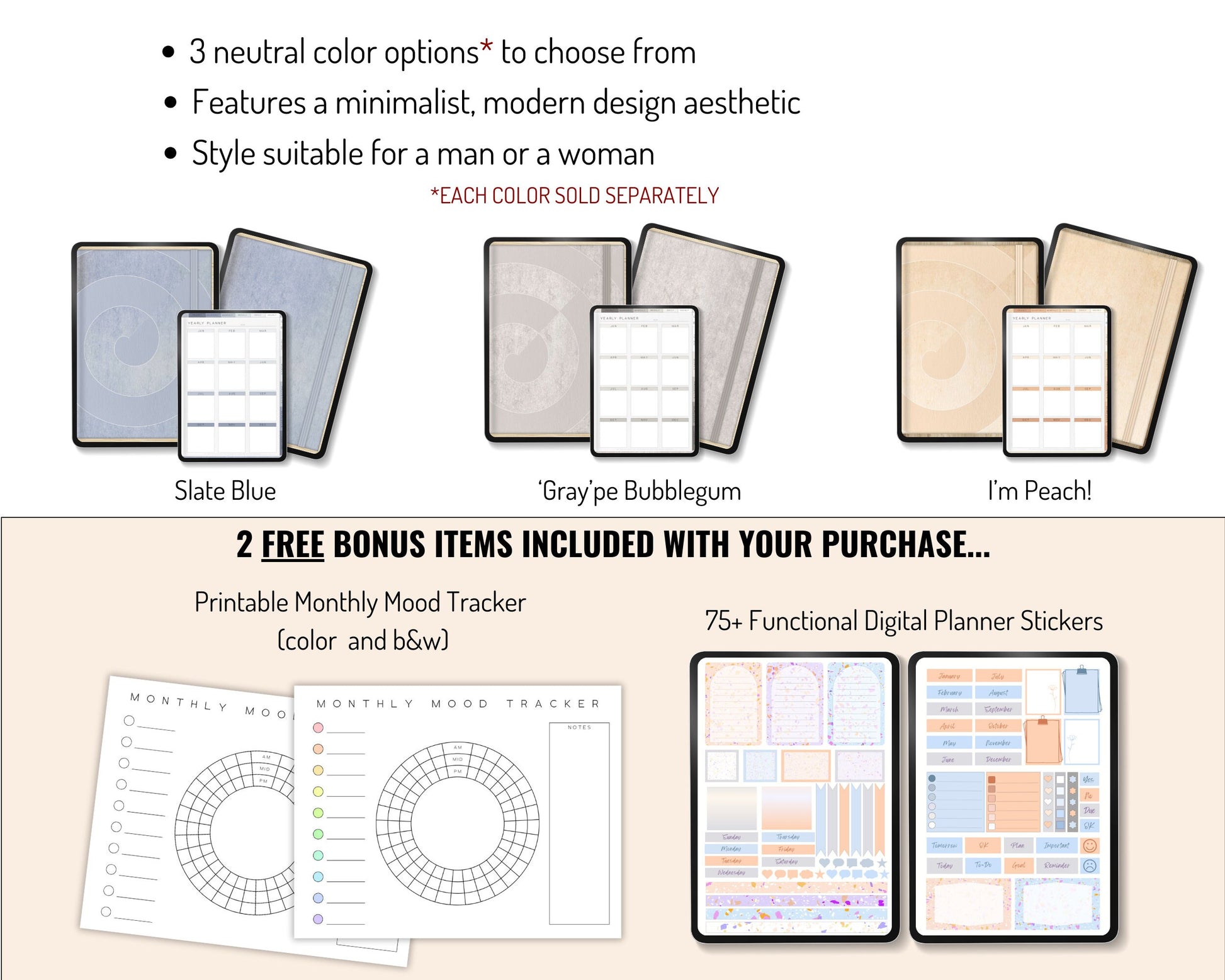 🔹Over 75 digital planner stickers I created just for this planner. PNGs can be resized (PNGs are sized to 500 x 500 px) and used individually, as many times as you like. They also come in full-sheet format.