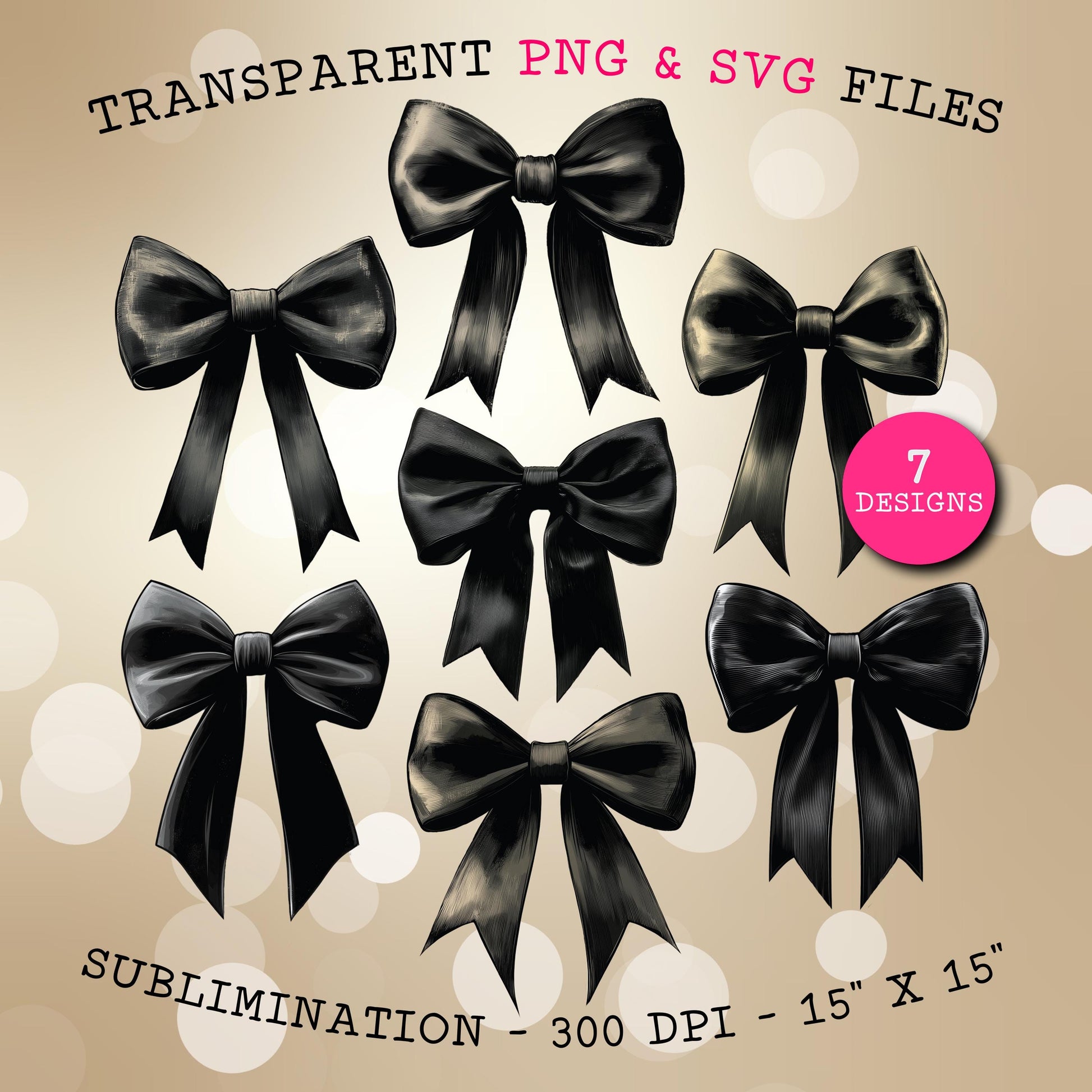 Bring your designs to life with this bundle of 7 unique black coquette bow PNG and SVG images!