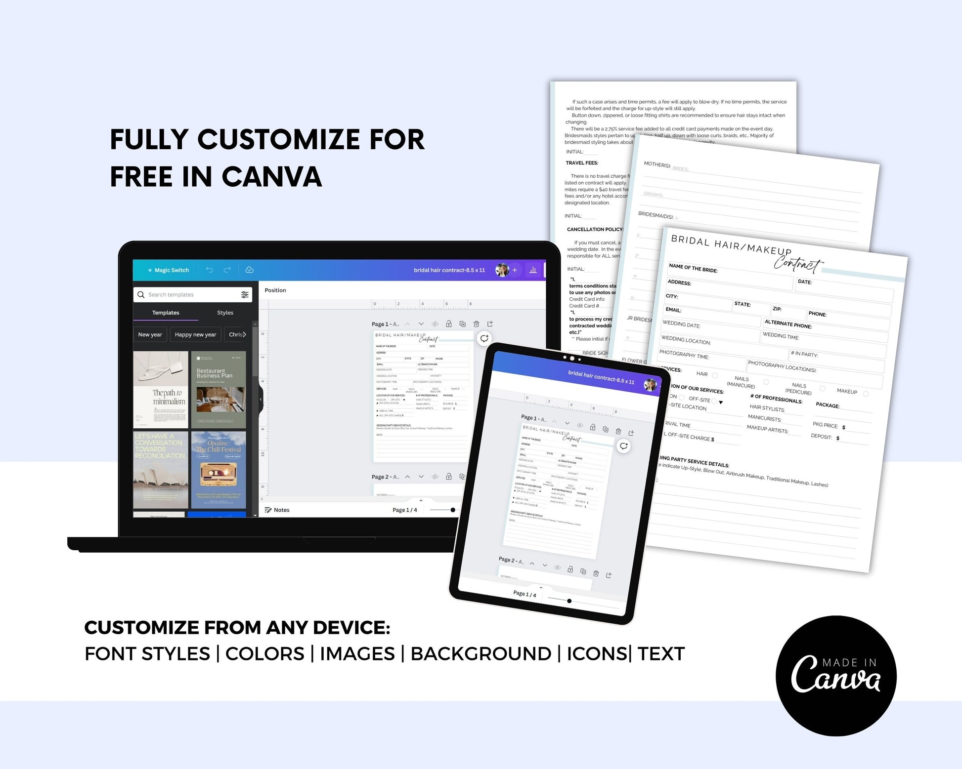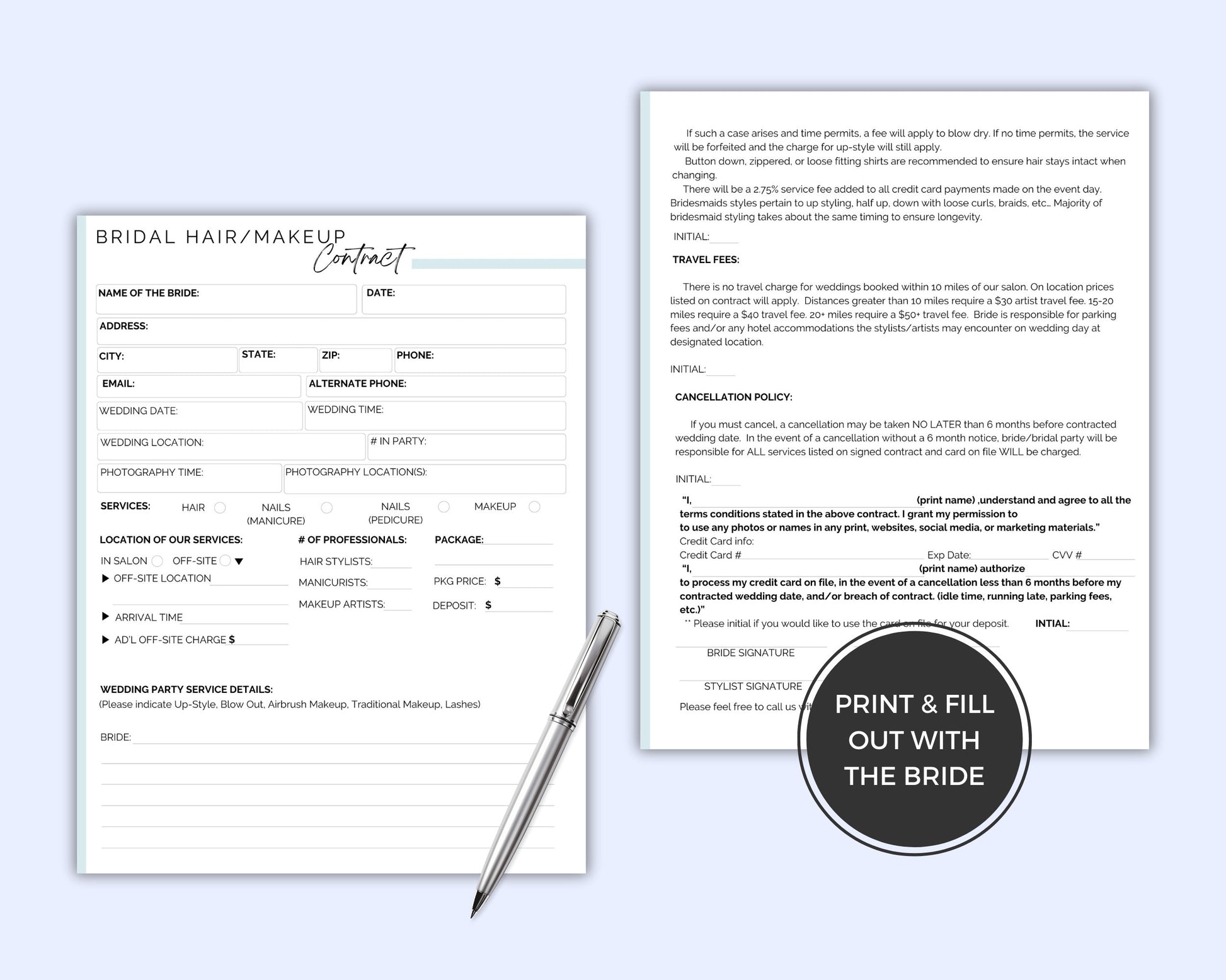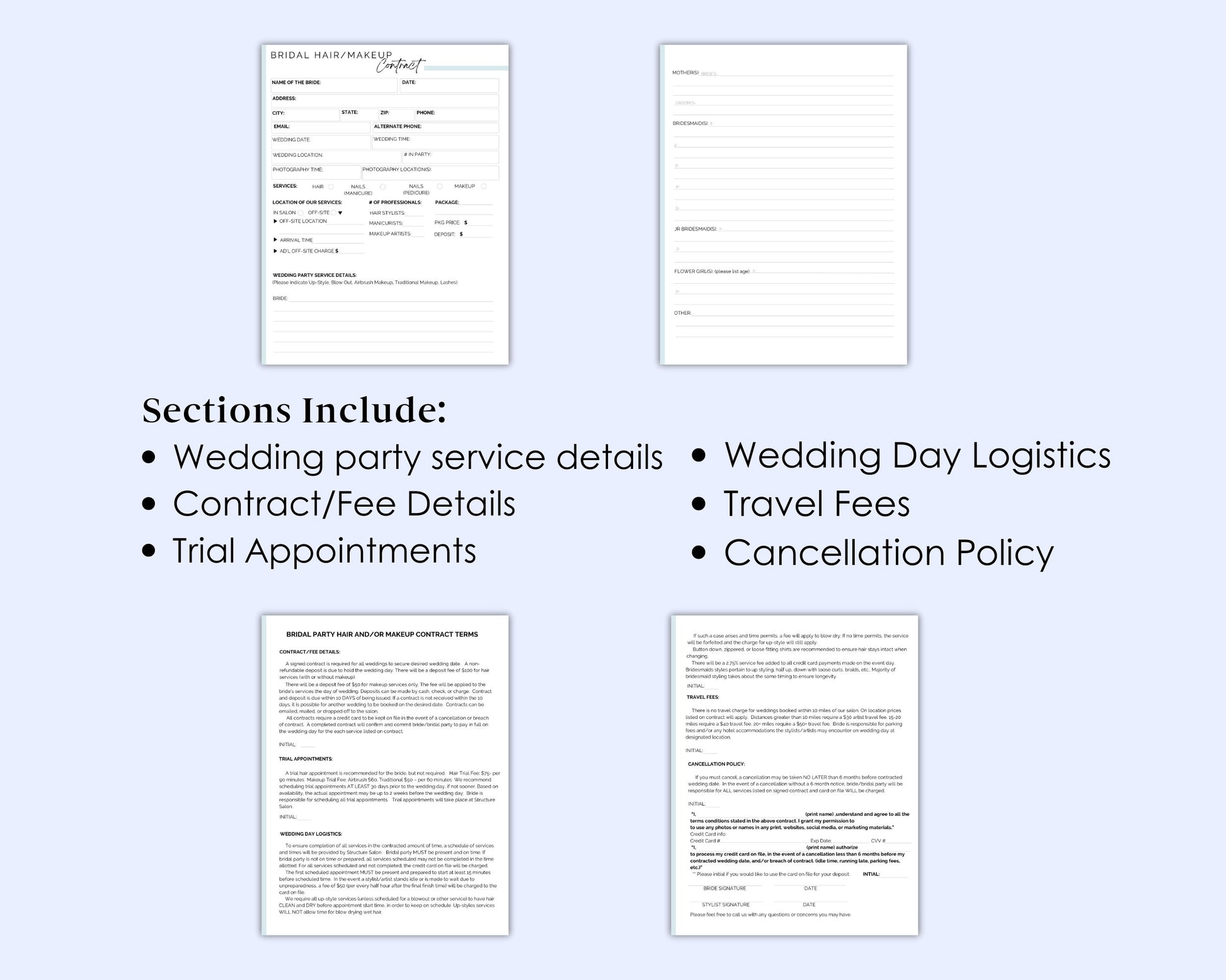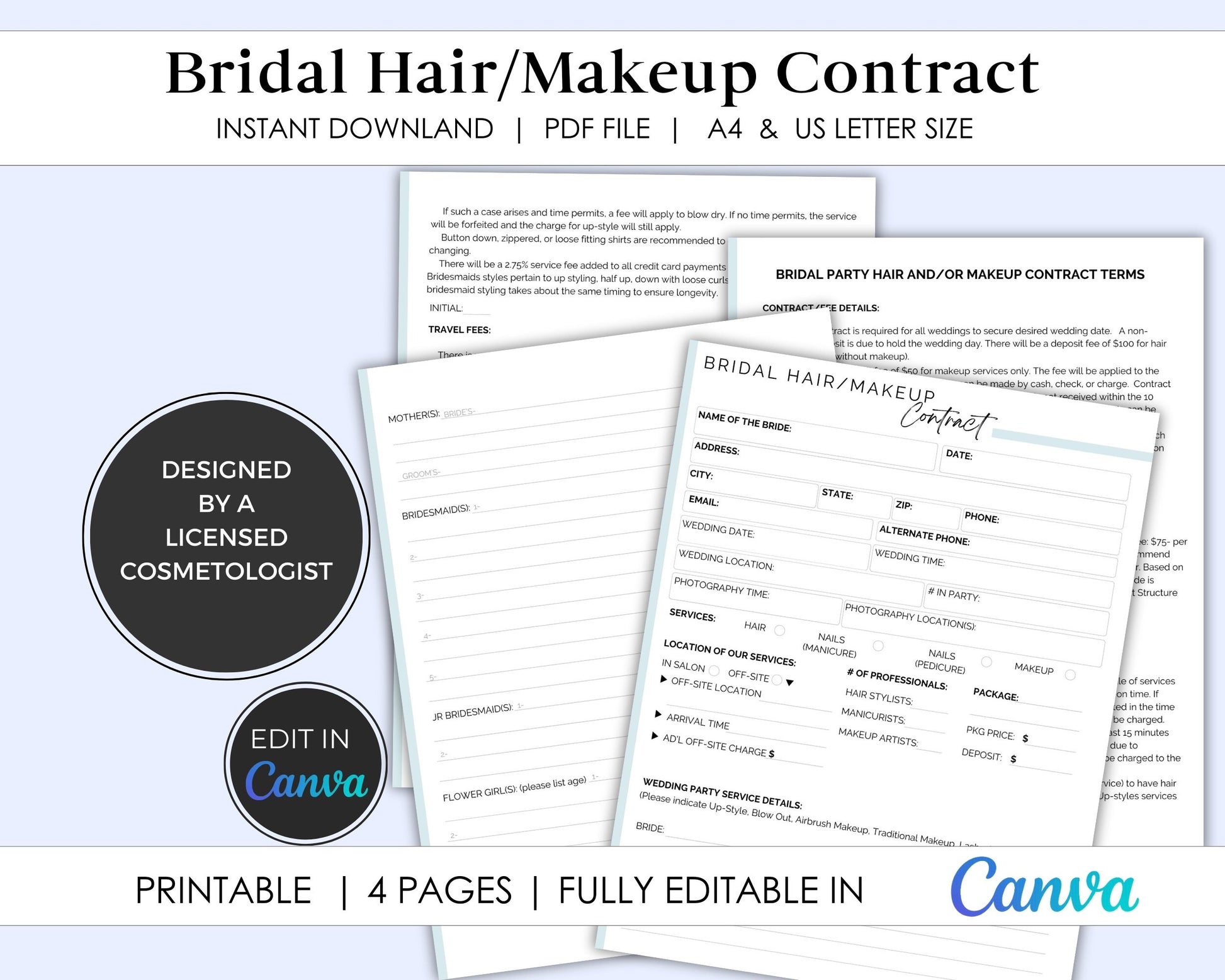 This Bridal Hair and Makeup Contract is designed to cover all bases and allow you to easily edit and revise to fit your own salon's policies.