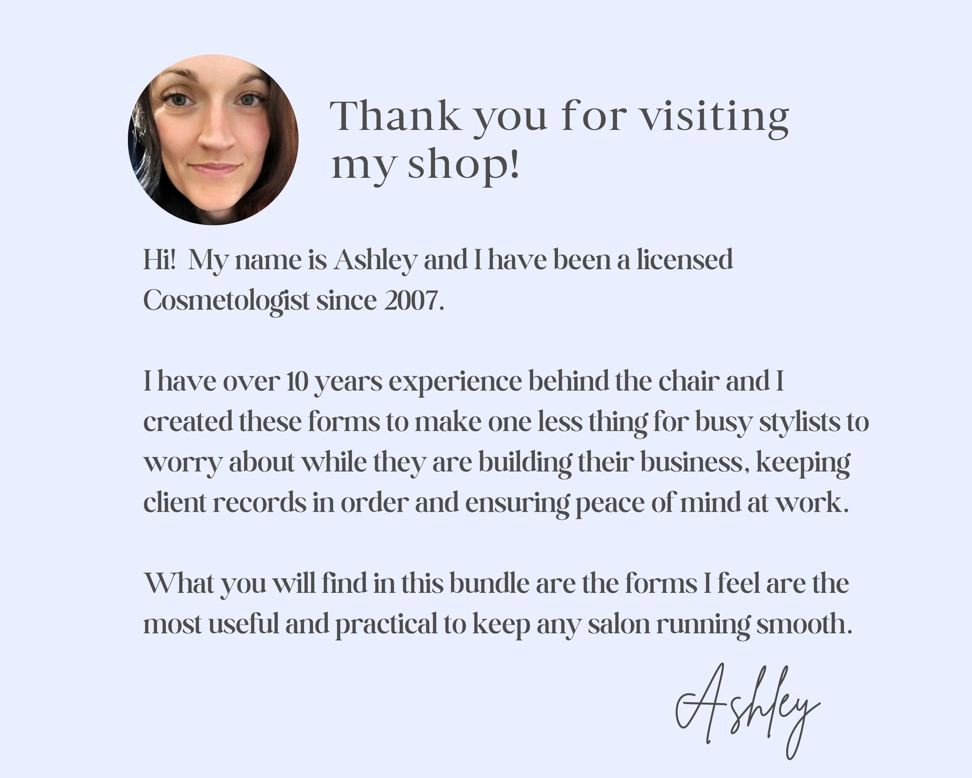 Hi, I'm Ashley, I have been a licensed Cosmetologist since 2007 and since then, I've had 10+ years of experience working in a salon environment. Anyone in the industry knows that having waivers and strict policies in-place is an absolute must.