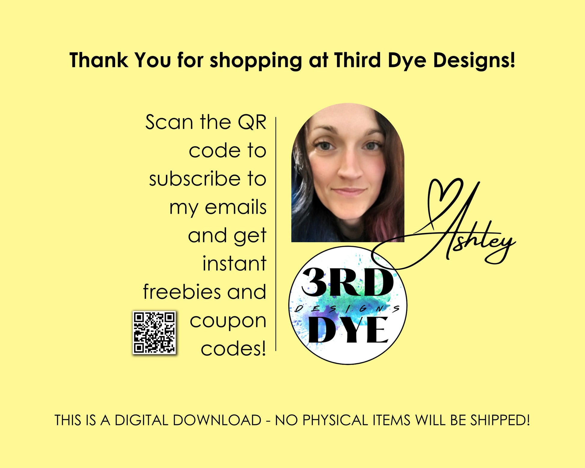 There is a no returns or refunds policy on all digital downloads purchased through Etsy, however if there is a problem with your purchase or you have questions or need help, please don't hesitate to reach out to me through my Etsy shop (https://etsy.com/shop/thirddyedesign) or by email at ashley@thirddyedesigns.com and I will do my best to help. If you email me, make sure to put something like, "printables help" in the subject line.