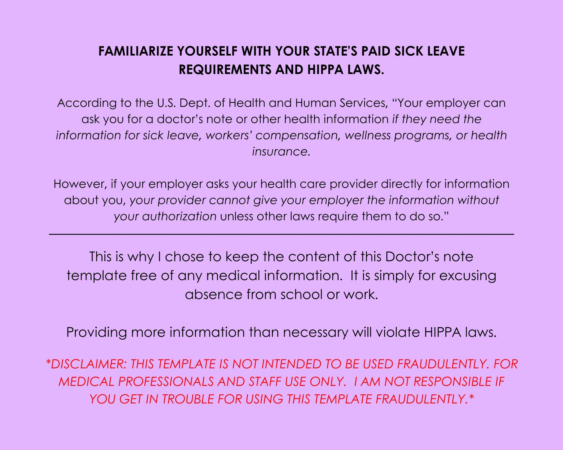 Be sure to check your local state laws on when it's legal for an employer to ask for a doctor's note. It should simply state when the patient can return to work. Don't violate HIPPA.