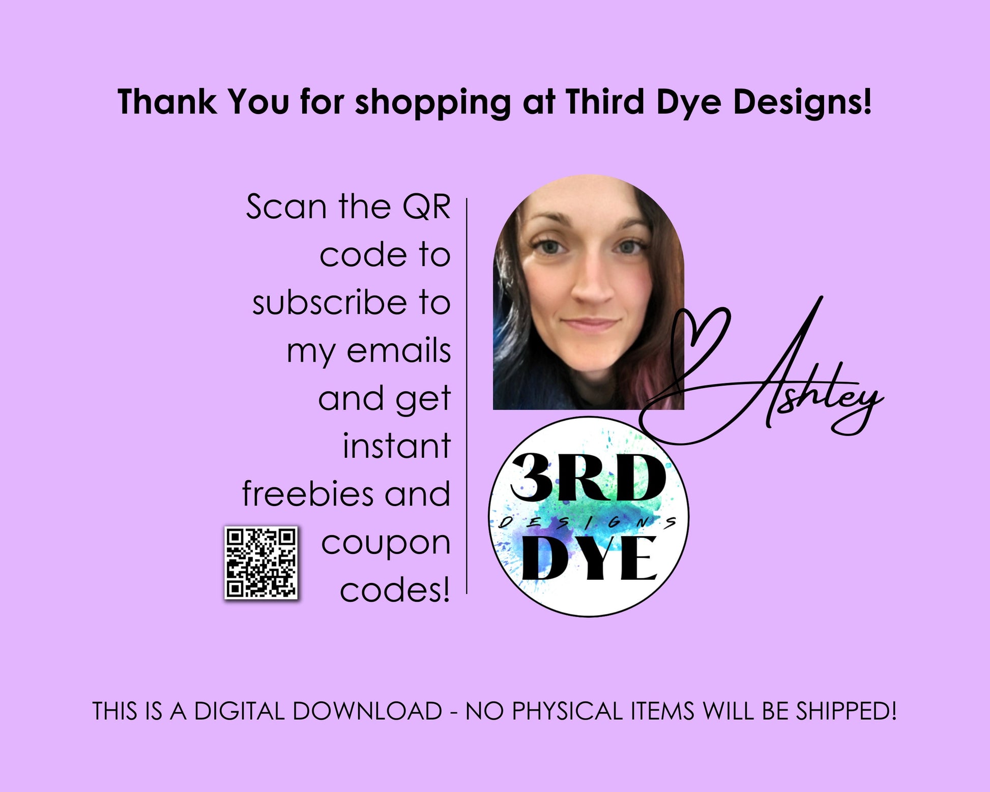 There is a no returns or refunds policy on all digital downloads purchased through Etsy, however if there is a problem with your purchase or you have questions or need help, please don't hesitate to reach out to me through my Etsy shop (https://etsy.com/shop/thirddyedesign) or by email at ashley@thirddyedesigns.com and I will do my best to help. If you email me, make sure to put something like, "printables help" in the subject line.