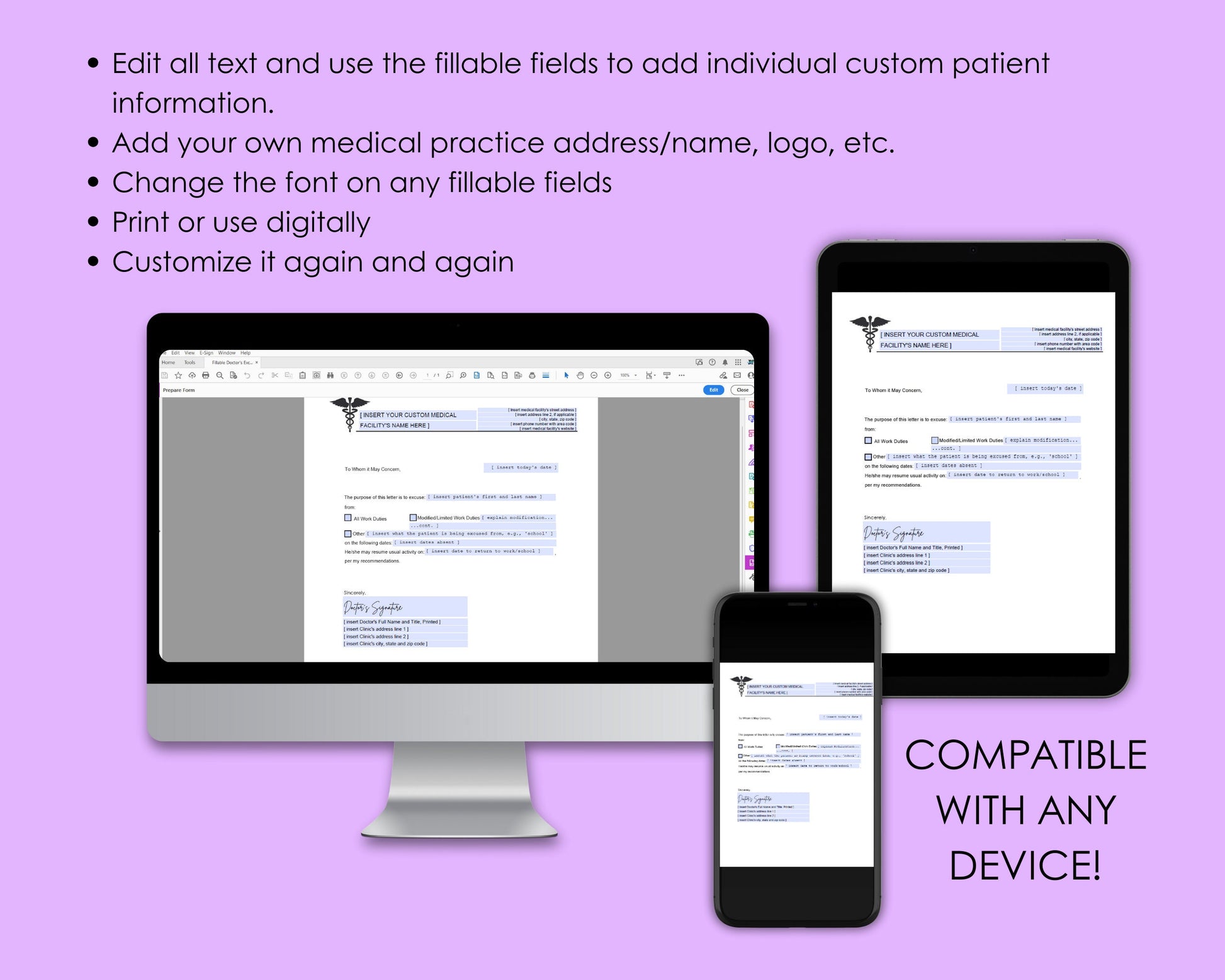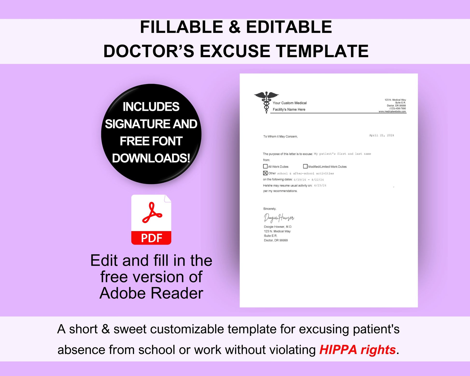 Editable in free Adobe Reader, this is a simple, 100% editable doctor's note template to excuse patient's absence from school or work. Fillable fields make it quick and easy to customize. Check out the HELP file for links to download the signature font for free!