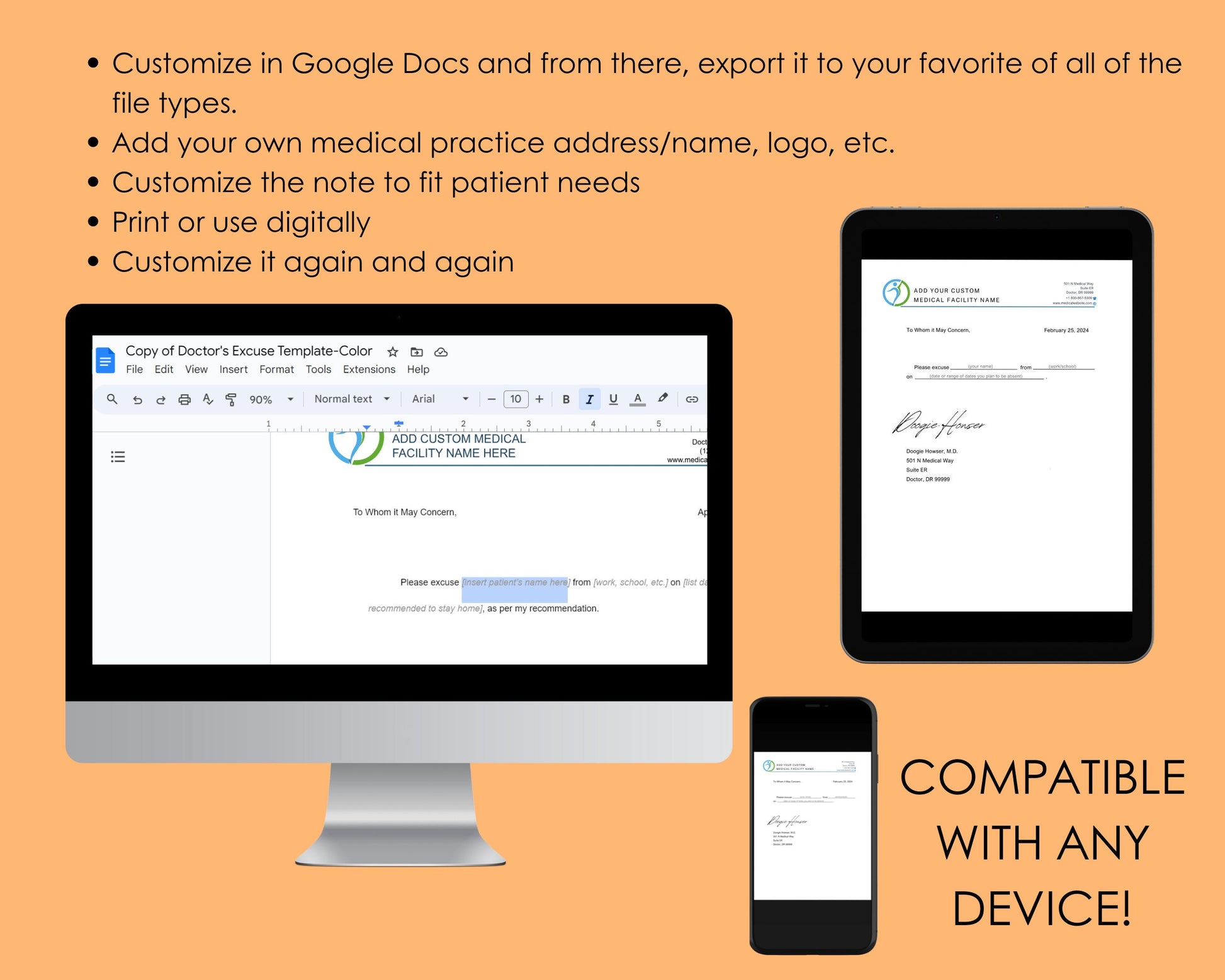 Editable in Google Docs, this is a simple, 100% editable doctor's note template to excuse patient's absence from school or work.