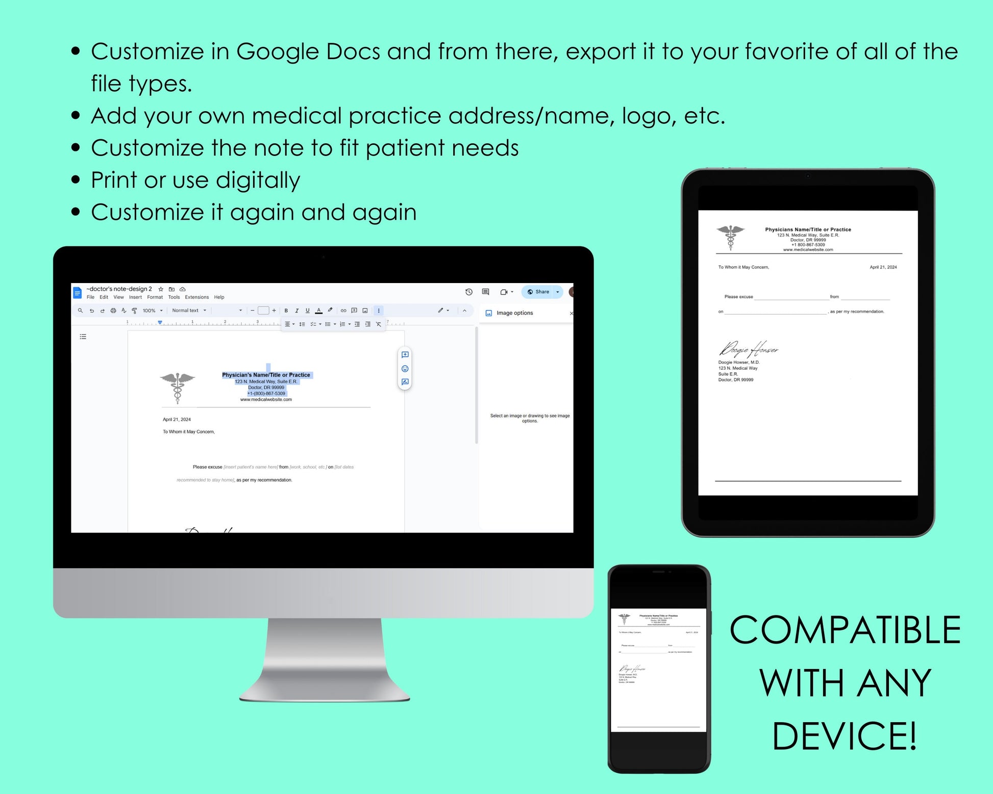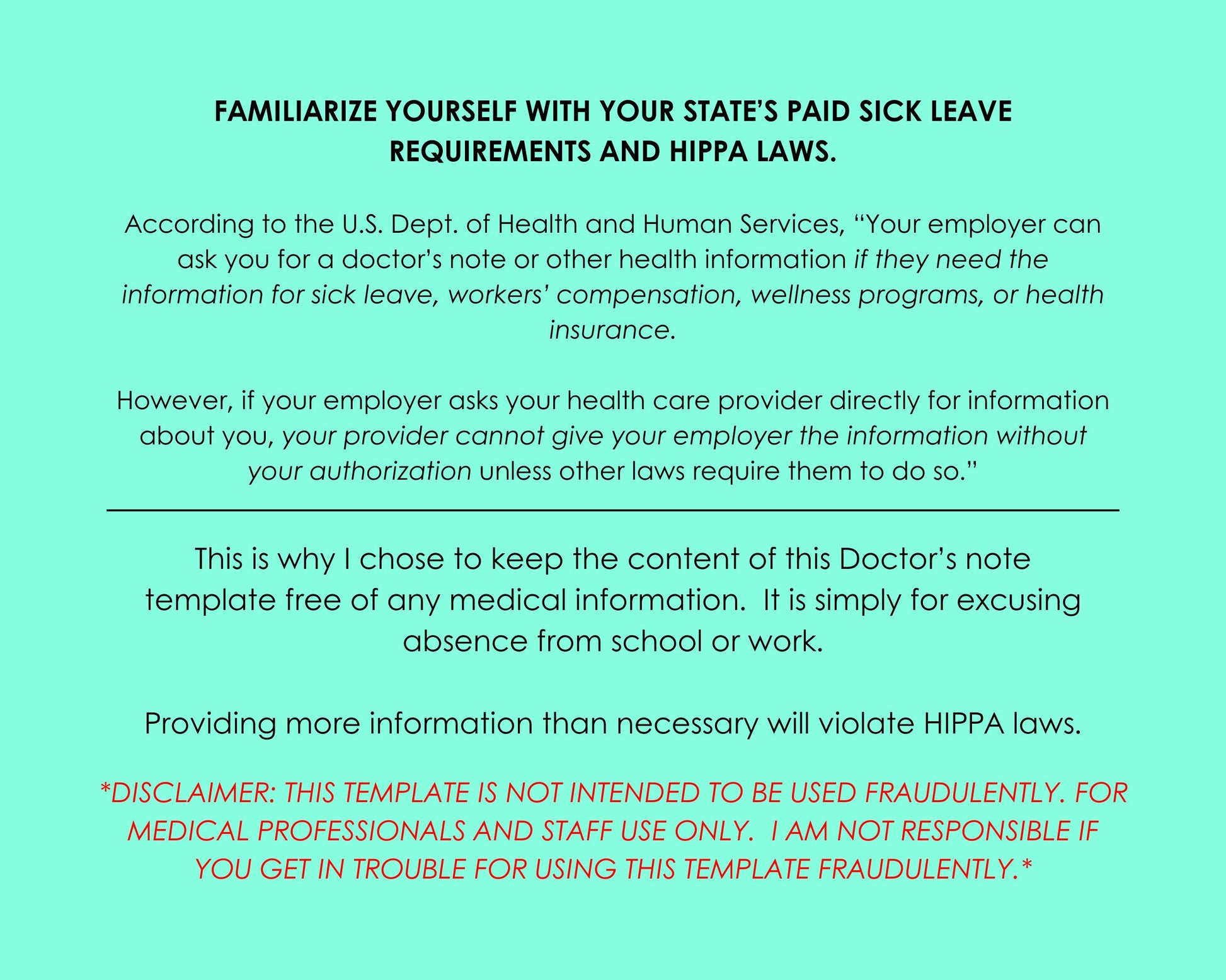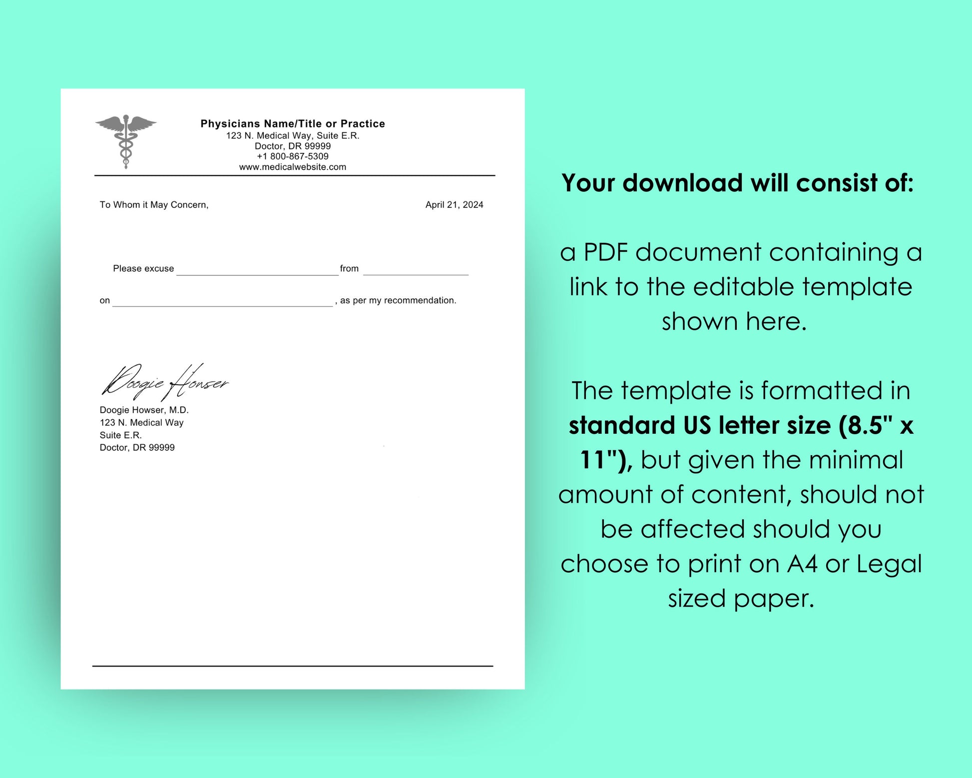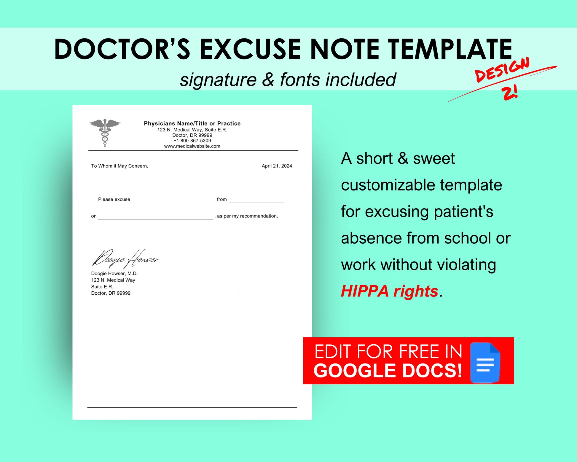 Editable in Google Docs, this is a simple, 100% editable doctor's note template to excuse patient's absence from school or work.