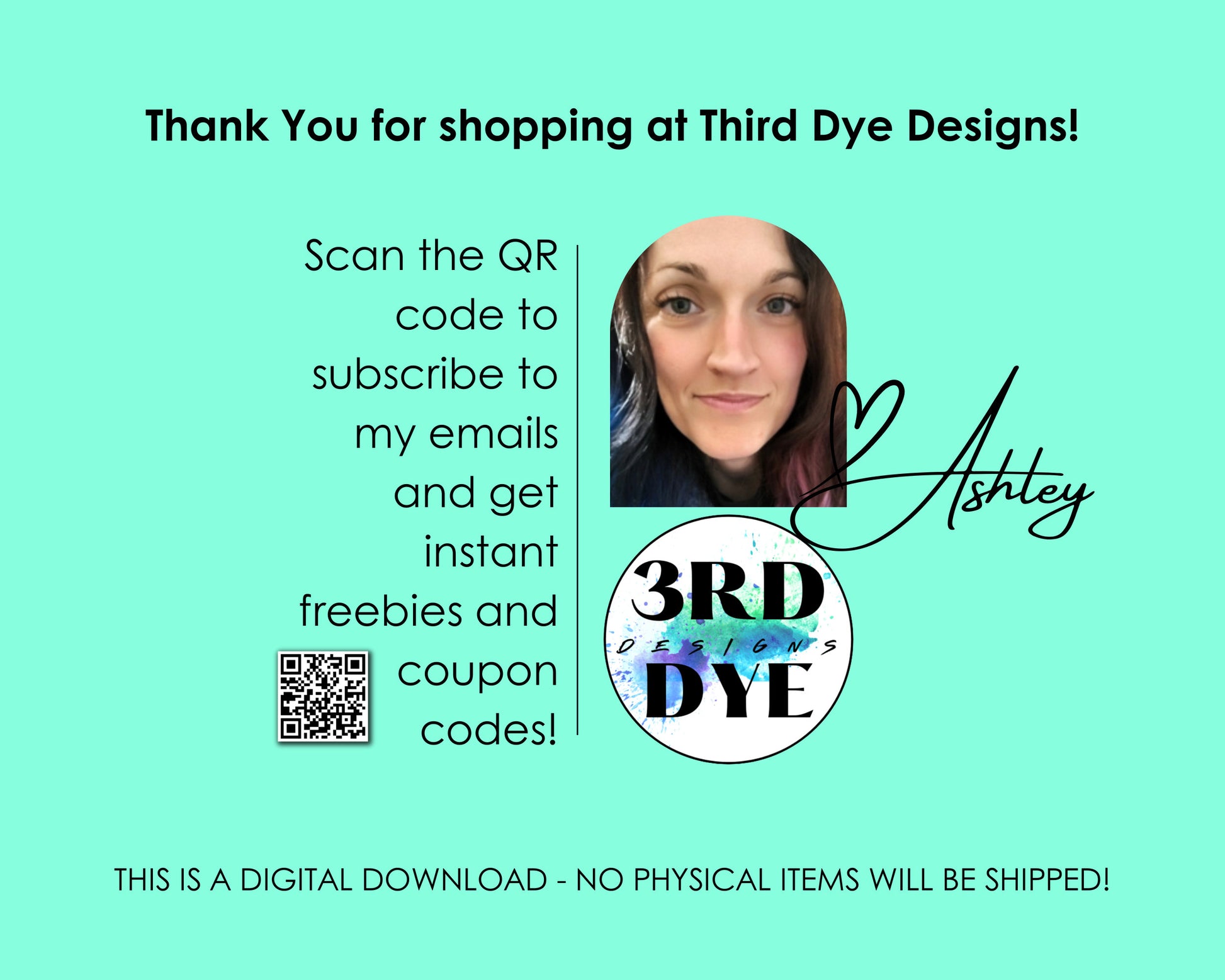 There is a no returns or refunds policy on all digital downloads purchased through Etsy, however if there is a problem with your purchase or you have questions or need help, please don't hesitate to reach out to me through my Etsy shop (https://etsy.com/shop/thirddyedesign) or by email at ashley@thirddyedesigns.com and I will do my best to help. If you email me, make sure to put something like, "printables help" in the subject line.