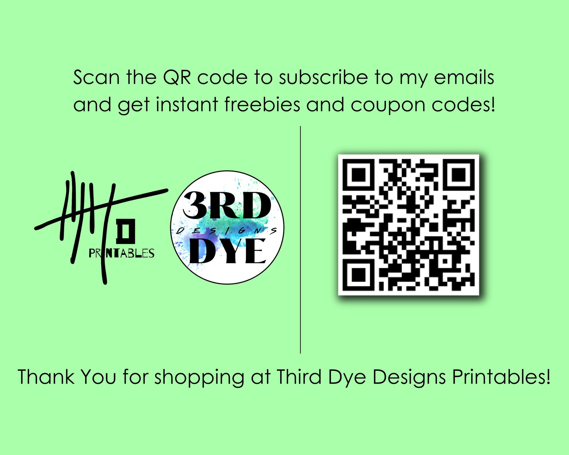 There is a no returns or refunds policy on all digital downloads purchased through Etsy, however if there is a problem with your purchase or you have questions or need help, please don't hesitate to reach out to me through my Etsy shop (https://etsy.com/shop/thirddyedesign) or by email at ashley@thirddyedesigns.com and I will do my best to help. If you email me, make sure to put something like, "printables help" in the subject line.