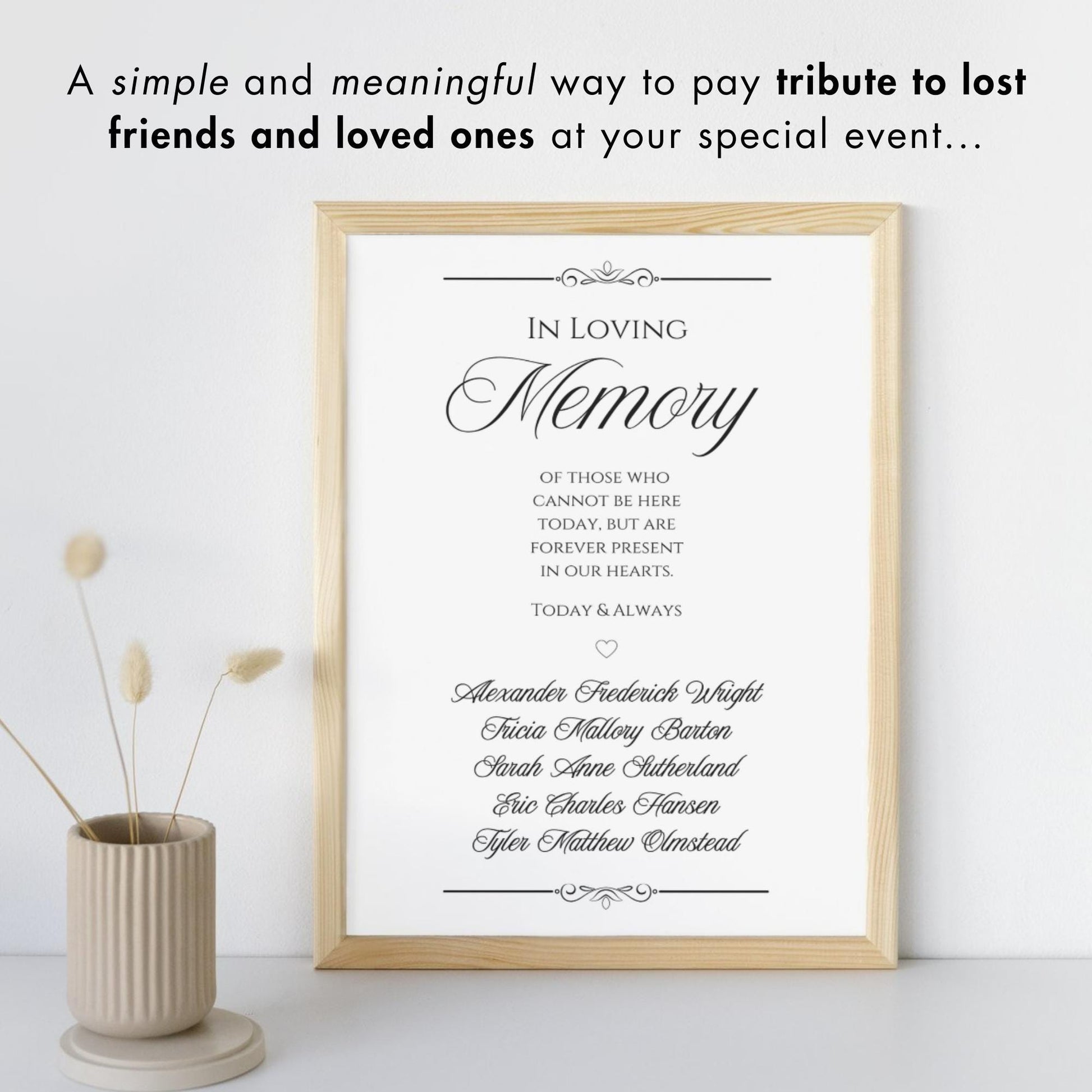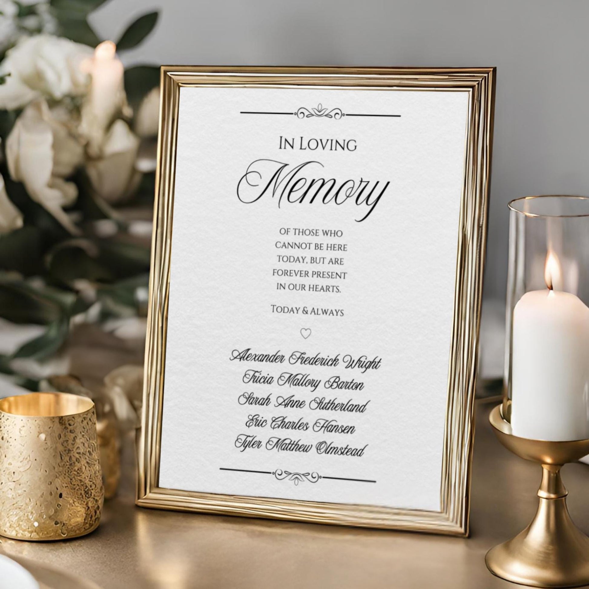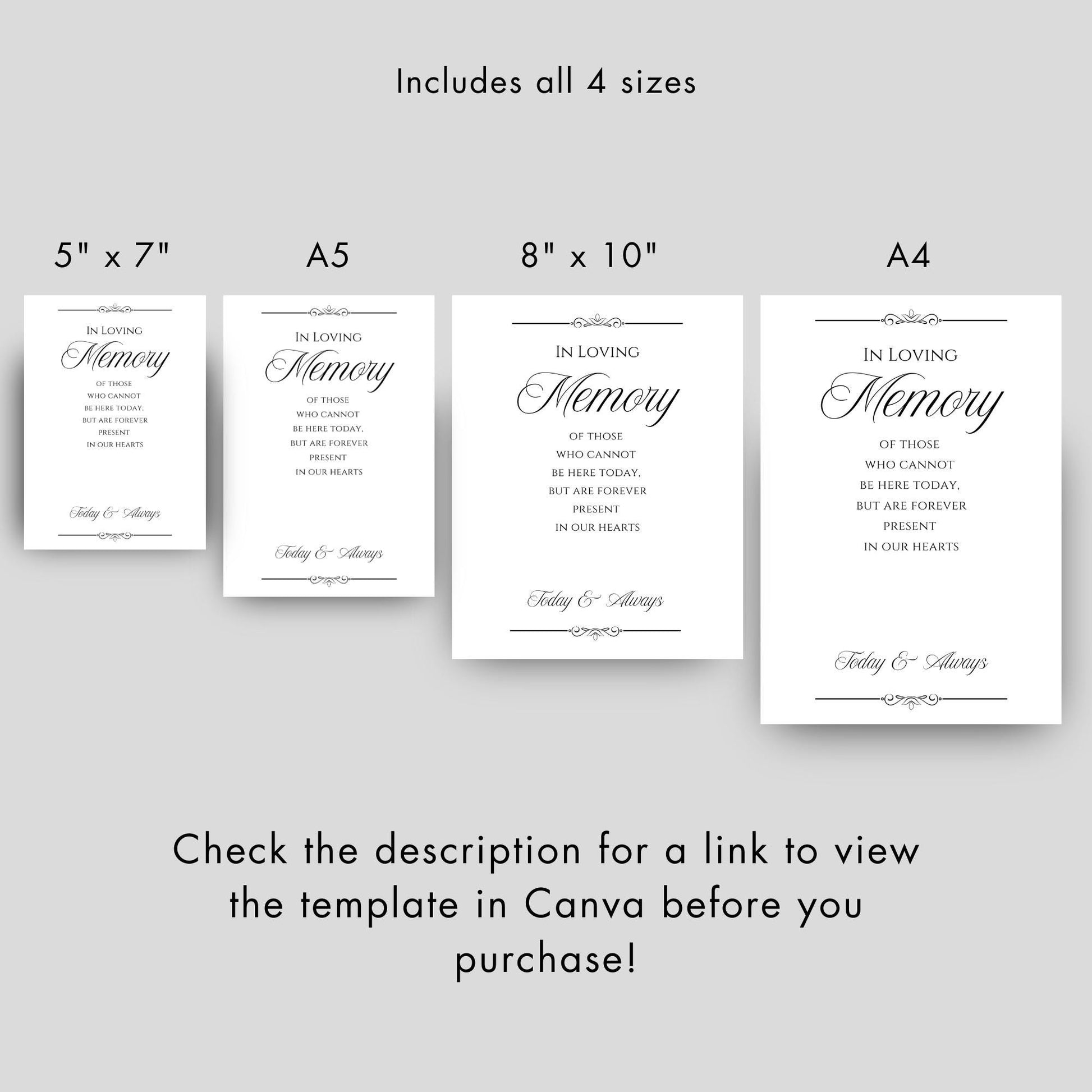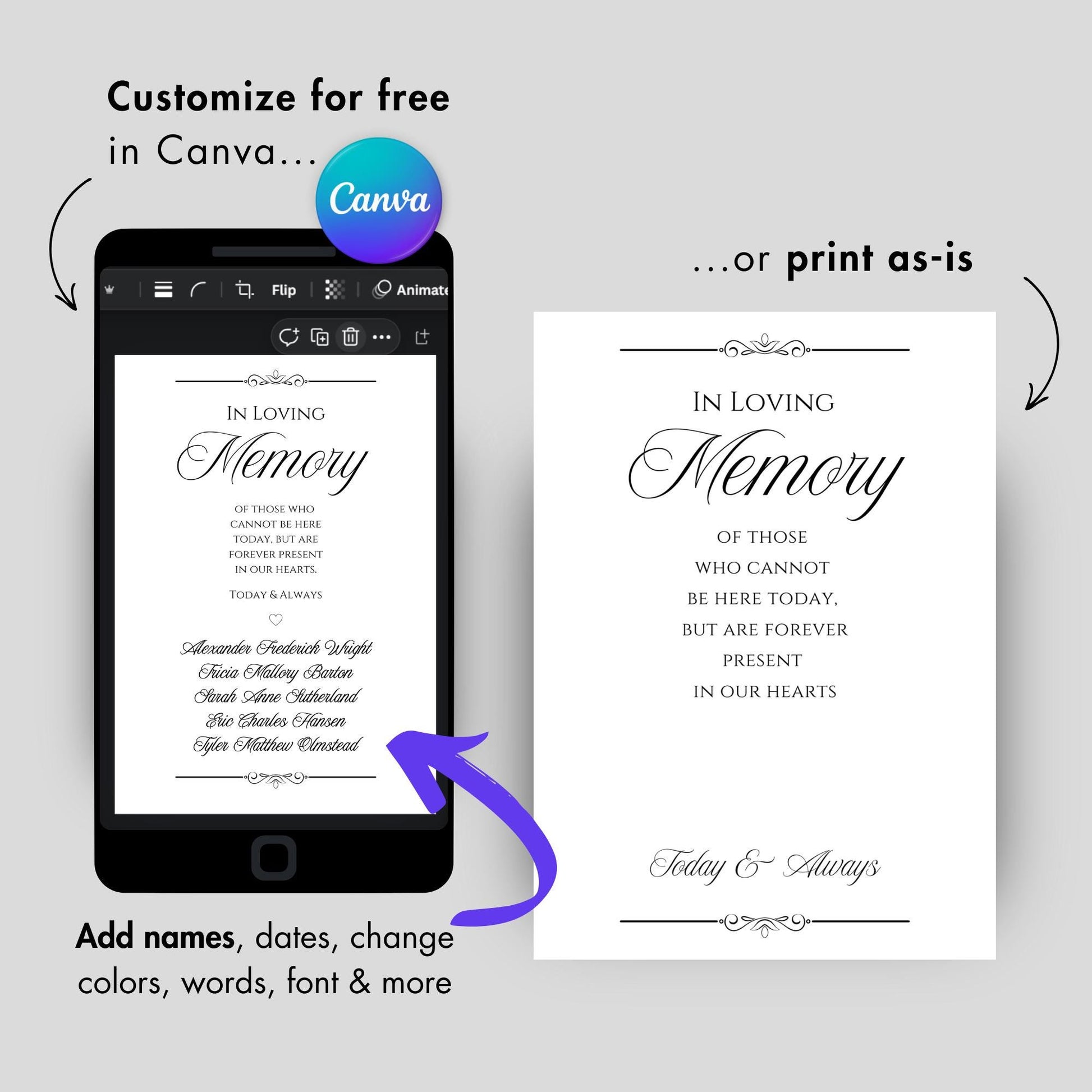 Editable memorial sign template - for high school reunions, college reunions, family reunions, weddings and more. Honor lost class mates. Create a meaningful tribute with this customizable design.