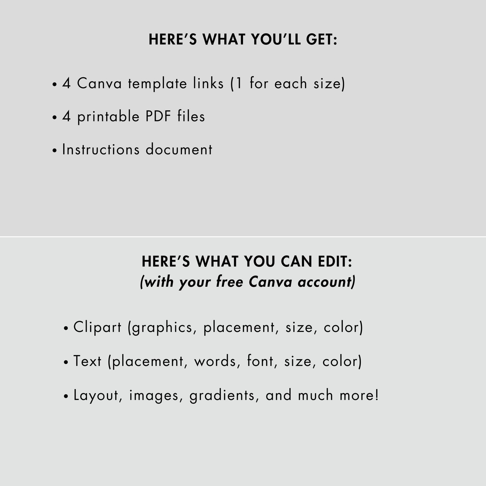 This contains 4 printable (as-is) PDFs if you don't want to make any edits in Canva.