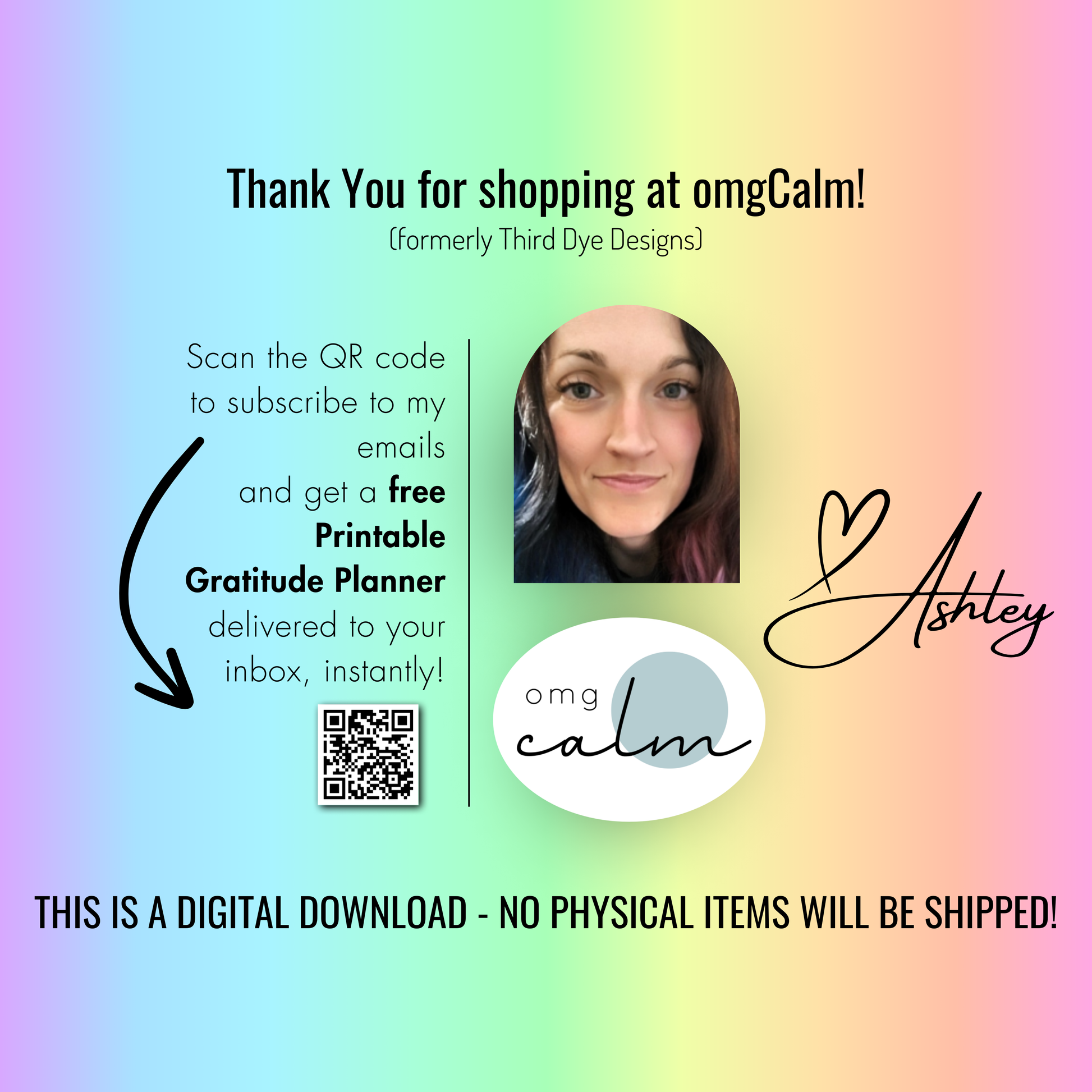 ☛There is a no returns or refunds policy on all digital downloads, however if there is a problem with your purchase or you have questions or need help, please don't hesitate to reach out to me via email at ashley@omgcalm.com and I will do my best to help. If you email me, make sure to put something like, "printables help" in the subject line.