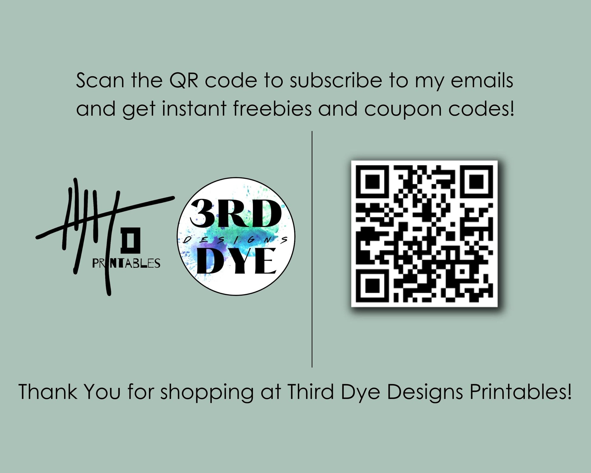 There is a no returns or refunds policy on all digital downloads purchased through Etsy, however if there is a problem with your purchase or you have questions or need help, please don't hesitate to reach out to me through my Etsy shop (https://etsy.com/shop/thirddyedesign) or by email at ashley@thirddyedesigns.com and I will do my best to help. If you email me, make sure to put something like, "printables help" in the subject line.