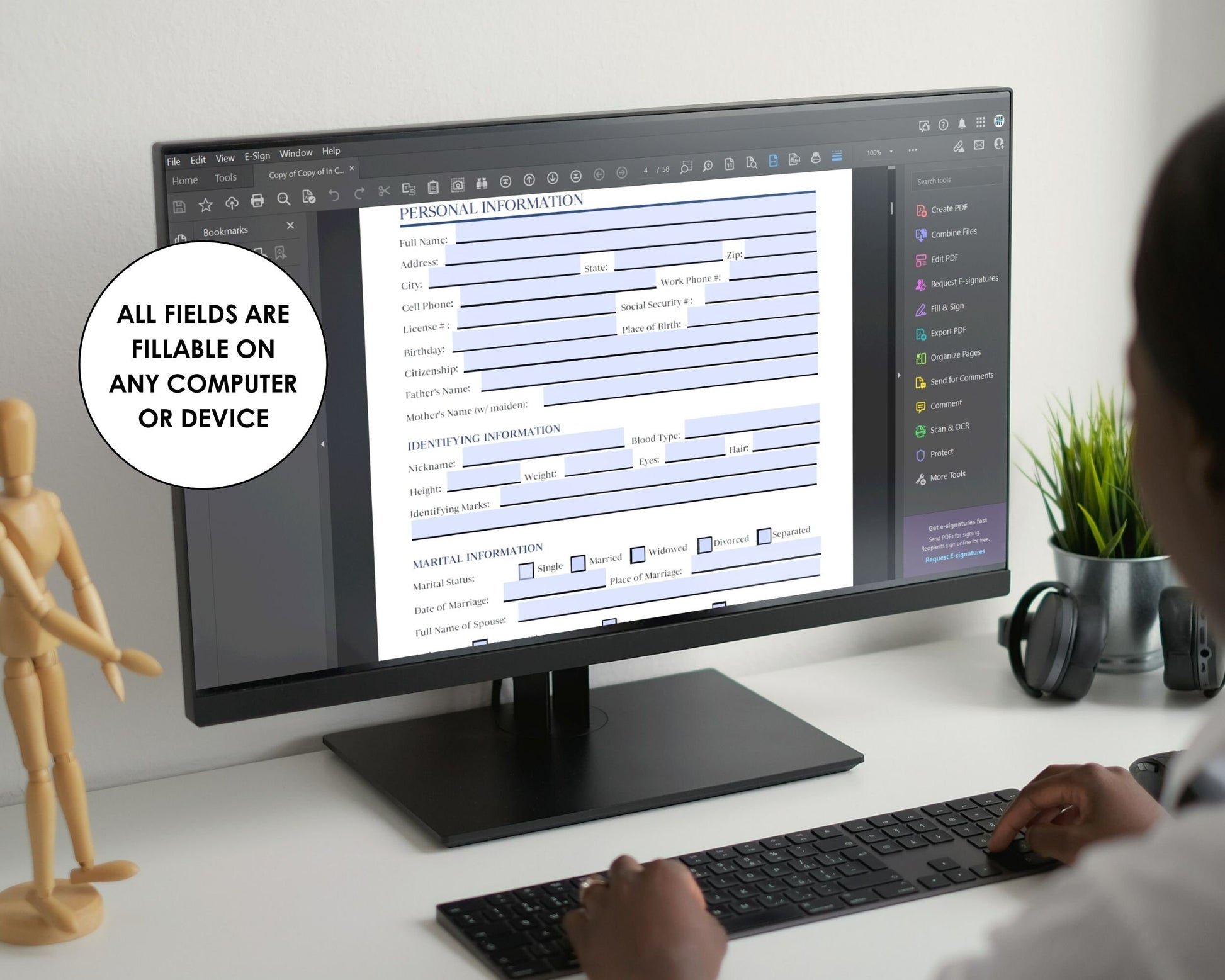 -1 PDF containing the 58-page document. The whole document has fillable fields so you can type in your information or you can simply print it blank and fill it in by hand, if you prefer.