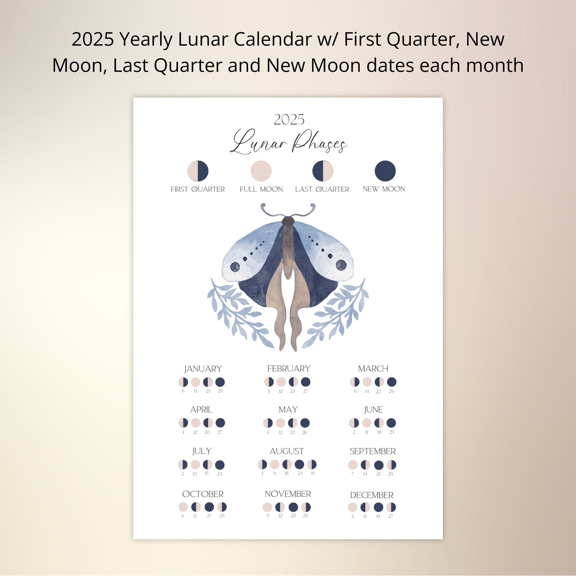 Each calendar clearly marks the first quarter, full moon, last quarter, and new moon for every month.