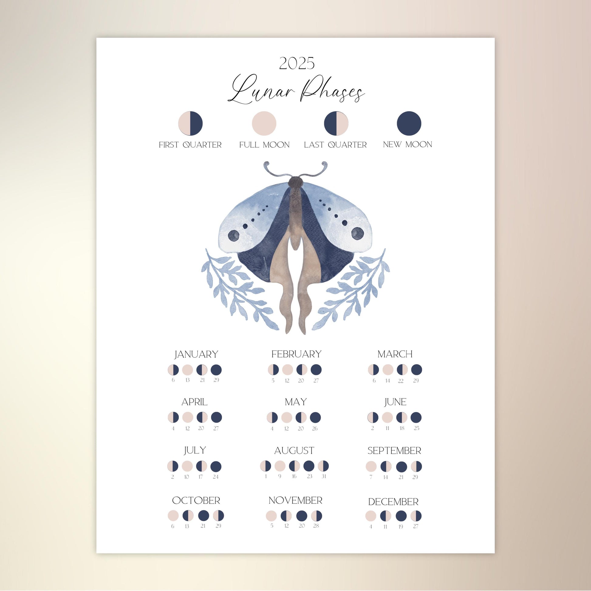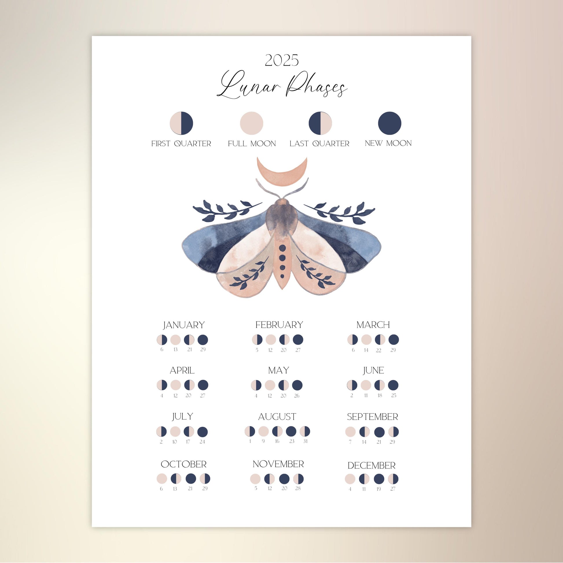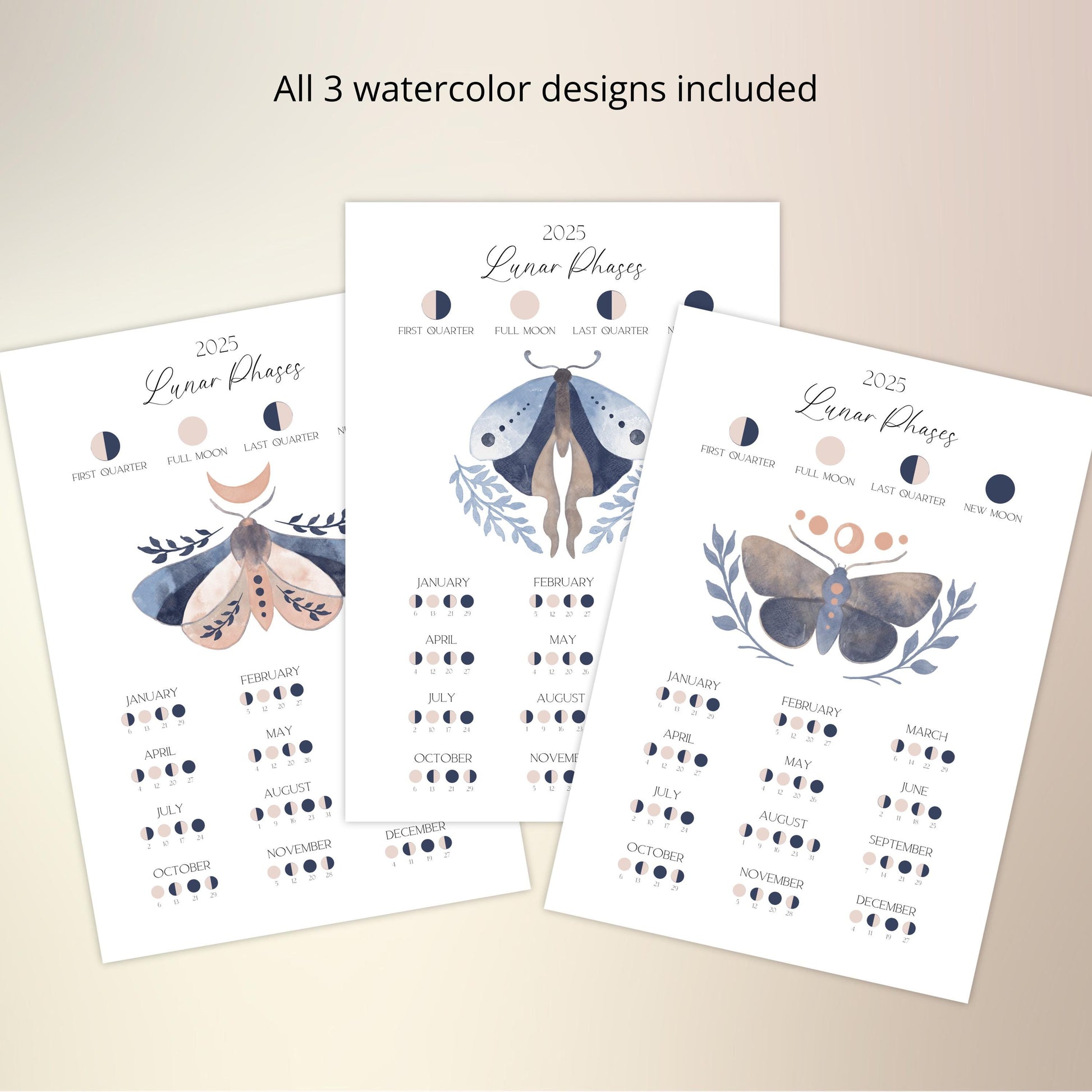 Track the 2025 lunar phases with this printable calendar featuring 3 watercolor designs and 4 size options.