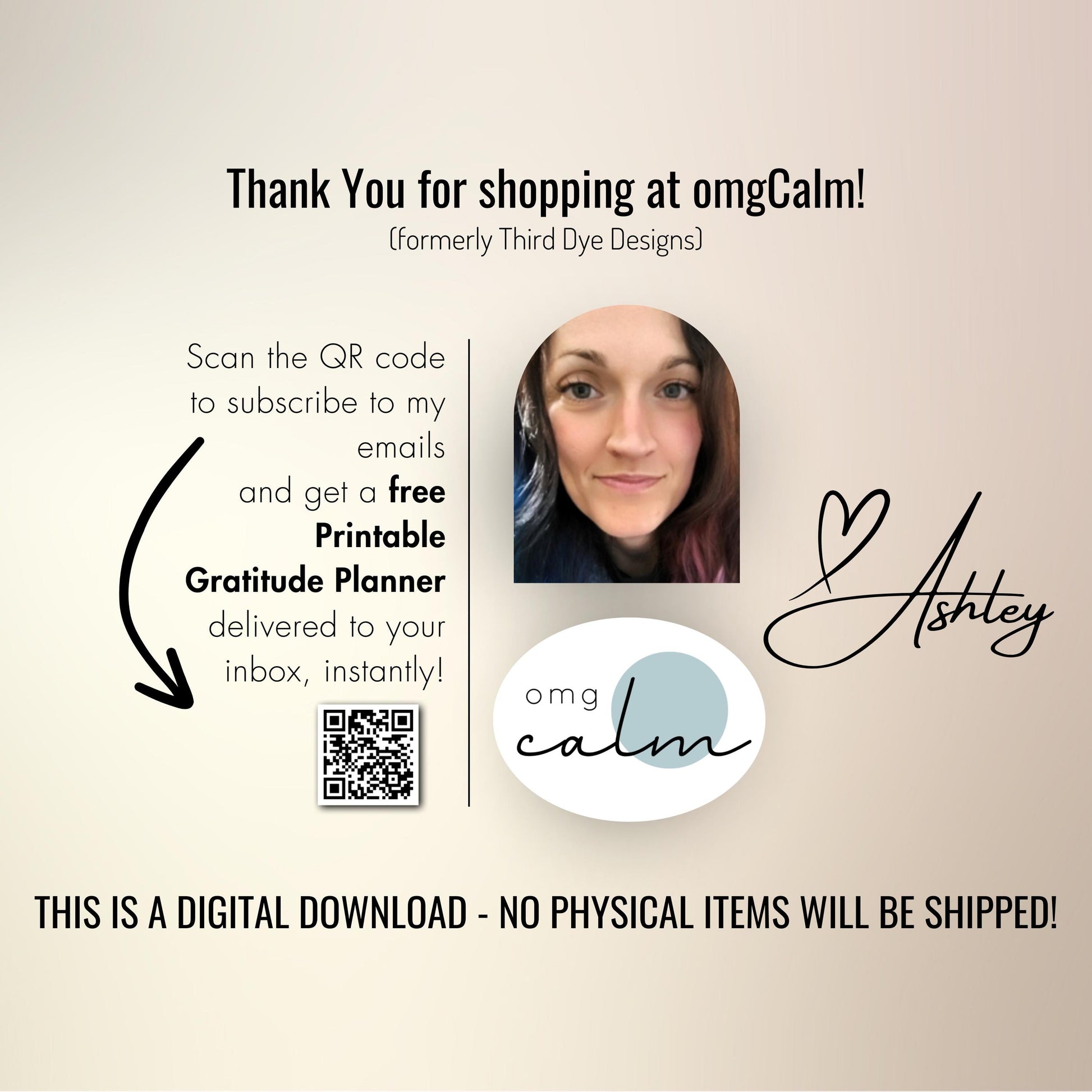 There is a no returns or refunds policy on all digital downloads, however if there is a problem with your purchase or you have questions or need help, please don't hesitate to reach out to me via email at ashley@omgcalm.com and I will do my best to help. If you email me, make sure to put something like, "printables help" in the subject line.