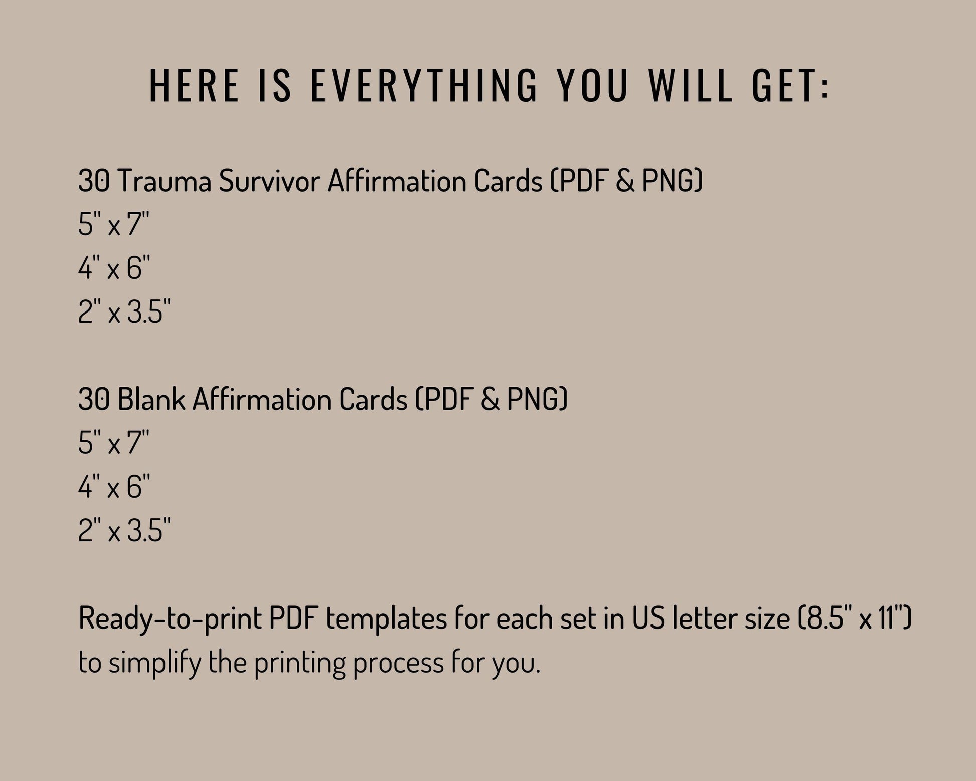 ✔ 30 Printable Affirmation Cards for Trauma Healing (PDF & PNG) in 3 sizes (5" x 7", 4" x 6", and 2" x 3.5")