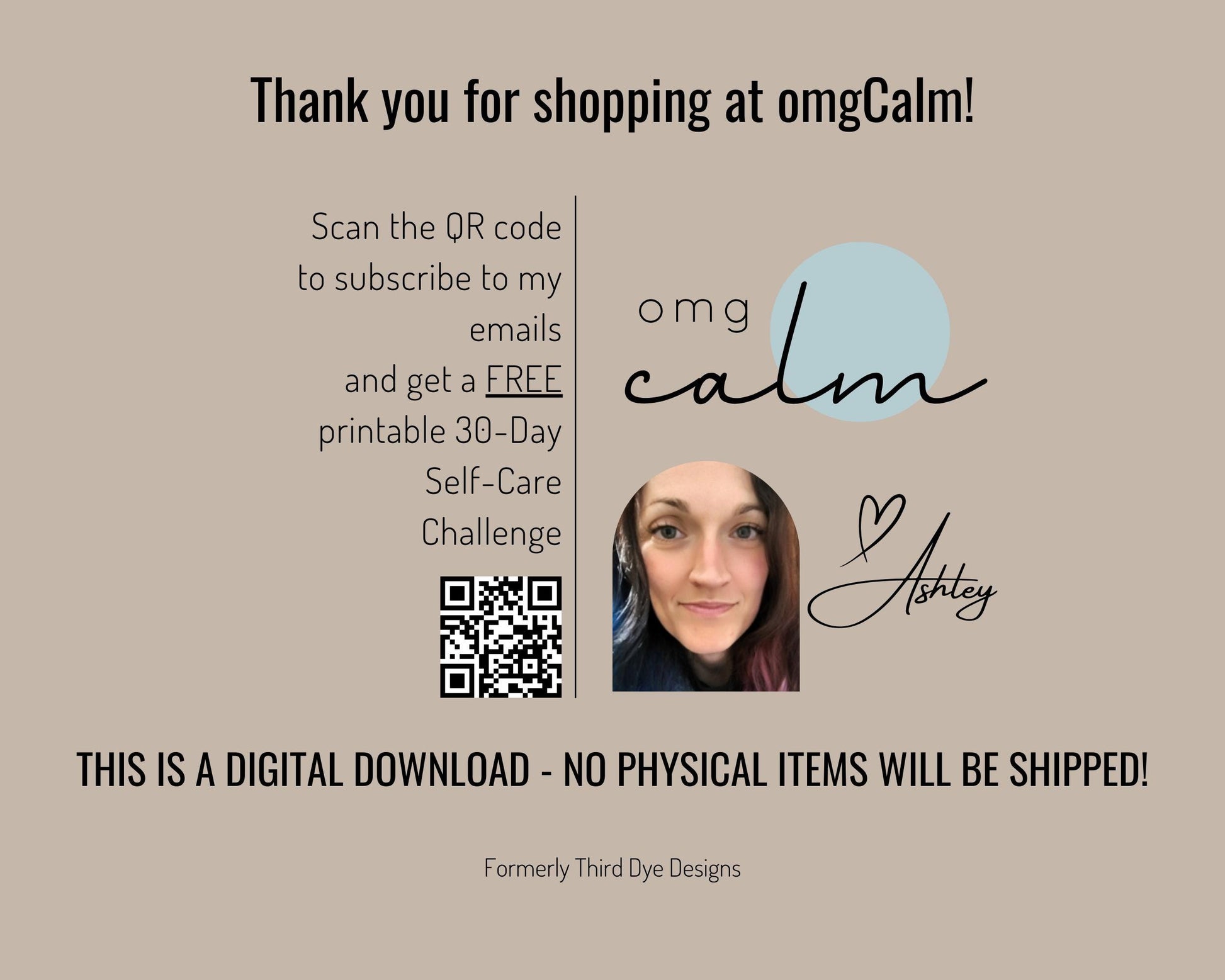 There is a no returns or refunds policy on all digital downloads, however if there is a problem with your purchase or you have questions or need help, please don't hesitate to reach out to me via email at ashley@omgcalm.com and I will do my best to help. If you email me, make sure to put something like, "printables help" in the subject line.