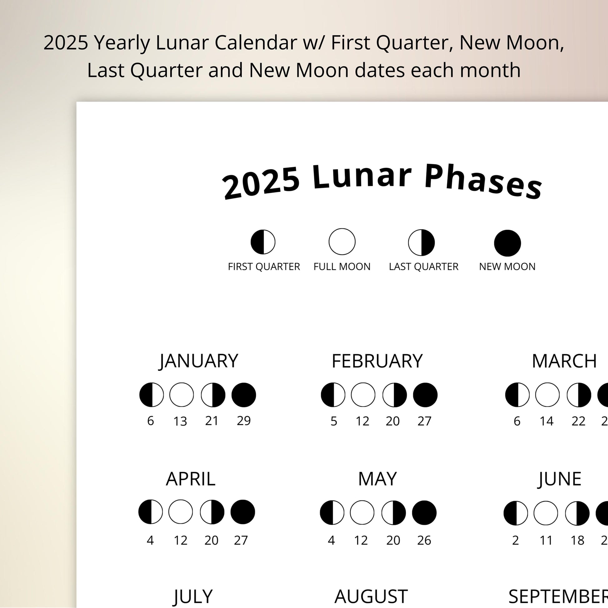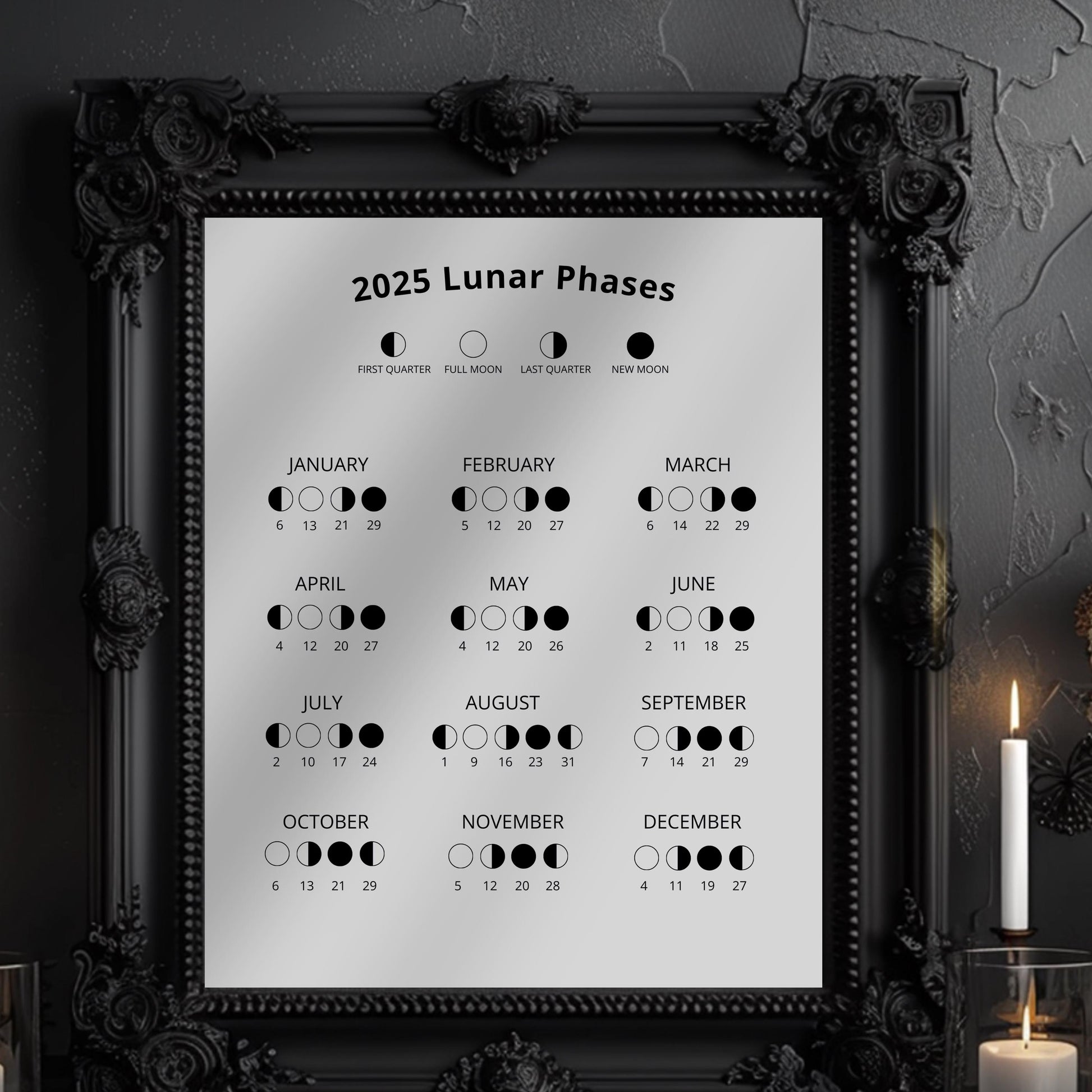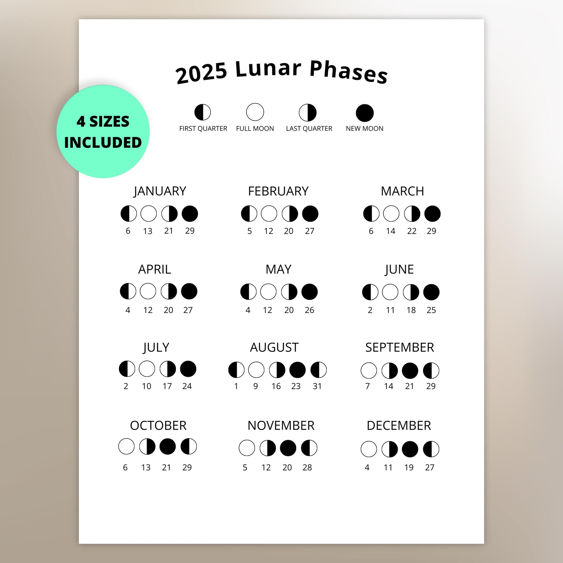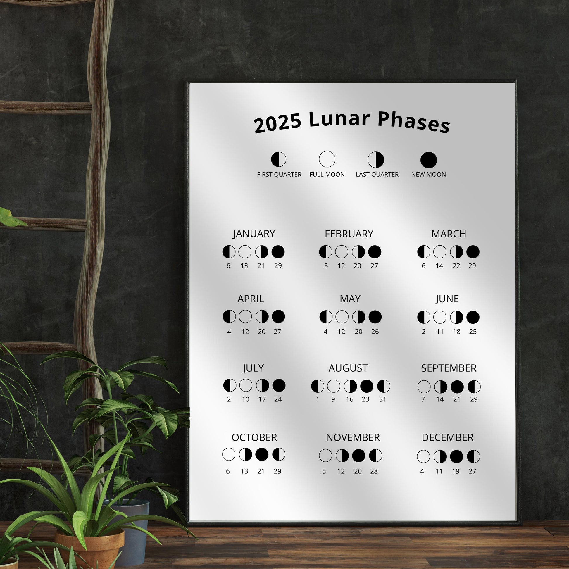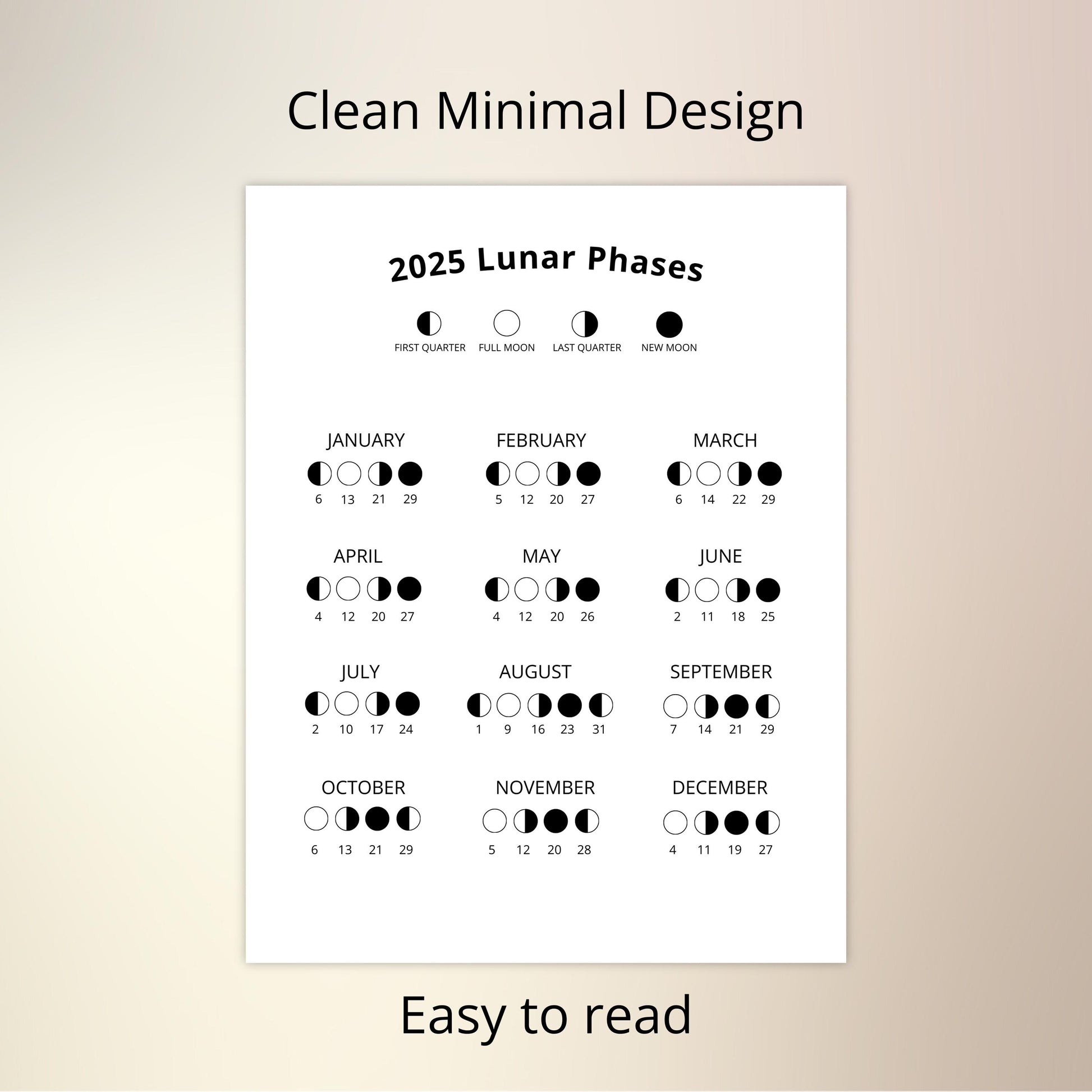 Track the 2025 lunar phases with this printable calendar featuring a clean, minimal design that is easy to read.